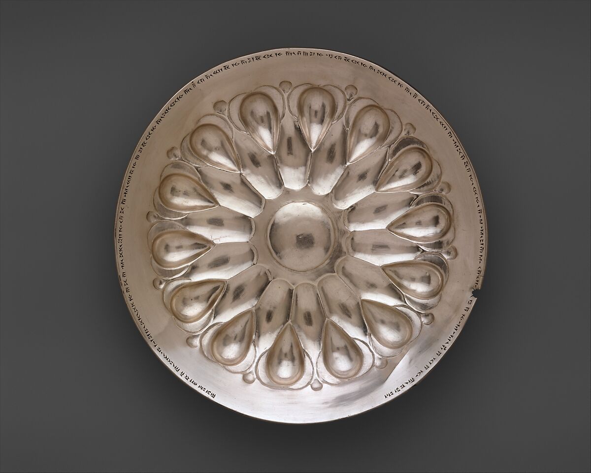 This silver drinking vessel is conventionally called a phiale (plural phialai), an ancient Greek term for any wide, shallow bowl. It has a carinated, or ridged, shoulder and a turned-out rim. In the center of the bowl is a raised boss, usually referred to by the Greek term omphalos, surrounded by fourteen tongue-shaped depressions. Between the depressions are deep, rounded lobes, or gadroons, and between these gadroons are smaller rounded lobes. A cuneiform inscription in Old Persian that runs around the interior of the rim reads "Artaxerxes, the great king, king of kings, king of lands, son of Xerxes the king, Xerxes son of Darius the king, the Achaemenid: in his house this silver bowl was made." The vessel was made by raising and sinking a single sheet of metal, and then adding chased details, a method that was employed for most Achaemenid metalware.