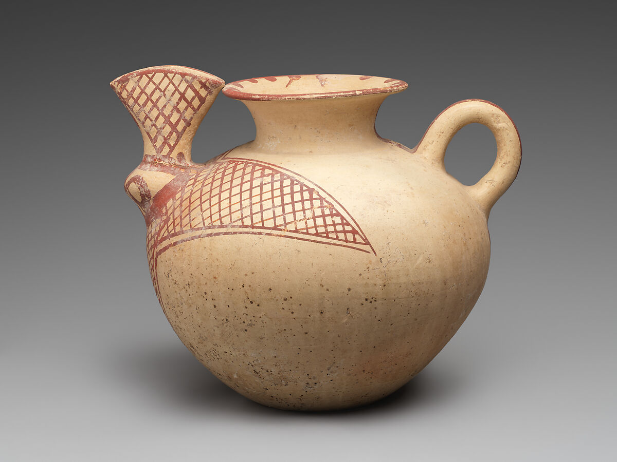 This pitcher has a squat body with a rounded shoulder, a short neck, and a flaring rim. A short spout emerges from one side of the body just below the shoulder and connects to the rim. A rounded handle connects the shoulder and the rim on the other side. The pitcher is buff, with painted reddish-brown decorations, including three rays with crosshatching surrounding the spout and dots on the rim. The combination of the spout and painted decorations suggest the form of a bird. The body and neck were made separately on a wheel, with the handle and spout added later.