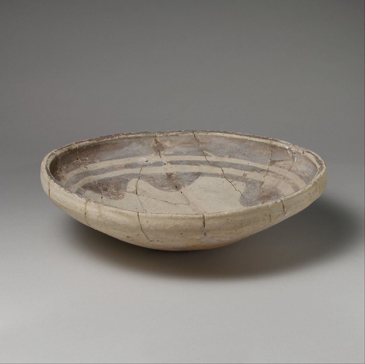 This dish is decorated with a dark brownish paint in three concentric rings. The band around the rim is the widest, while the inner ring is ornamented with three groups of double half-moons in solid paint facing the center of the dish. The dark painted pale pottery characteristic of the Ubaid period has been found throughout Mesopotamia. It originated in the south, and then spread north and west. Over time the designs changed, which helps archaeologists to date sites where it is found. The whole sequence of Ubaid pottery was excavated at the southern Mesopotamian site of Eridu, where this bowl was discovered in a grave (Ubaid Cemetery, Grave 136). Toward the end of the Ubaid period in the south, pottery was less skillfully painted but some of the grave pottery, like this one, has simple but bold and effective designs.