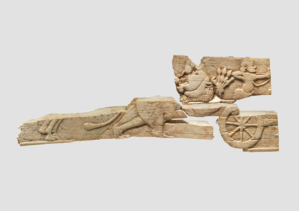 This object is one of three related fragments in the collection of the Metropolitan Museum, said to be from Ziwiye, which depict hunting and battle scenes (51.131.9; 51.131.11; 51.131.12). Stylistic differences suggest they were carved by different artisans, but all three show a familiarity with the scenes depicted in the stone reliefs that decorated Assyrian palaces. Because of their similarity to the Assyrian reliefs, they have been classified as Assyrian style ivories. They were likely used as furniture decoration. On this piece, a roaring lion attacks a chariot, in which an archer rides, drawing his bow. At left, the rear hooves and tail of a horse can be seen; as the front hooves do not appear on the plaque, the horse may be rearing over the attacking lion. The dynamics of the conflict between the lion and archer are difficult to understand, since the lion turns his head away from the chariot while the archer aims his bow in the opposite direction. The oversized head and raised paw of the lion are much larger than the tiny figure of the archer. Details such as the lion’s mane and the tail of the horse are incised.