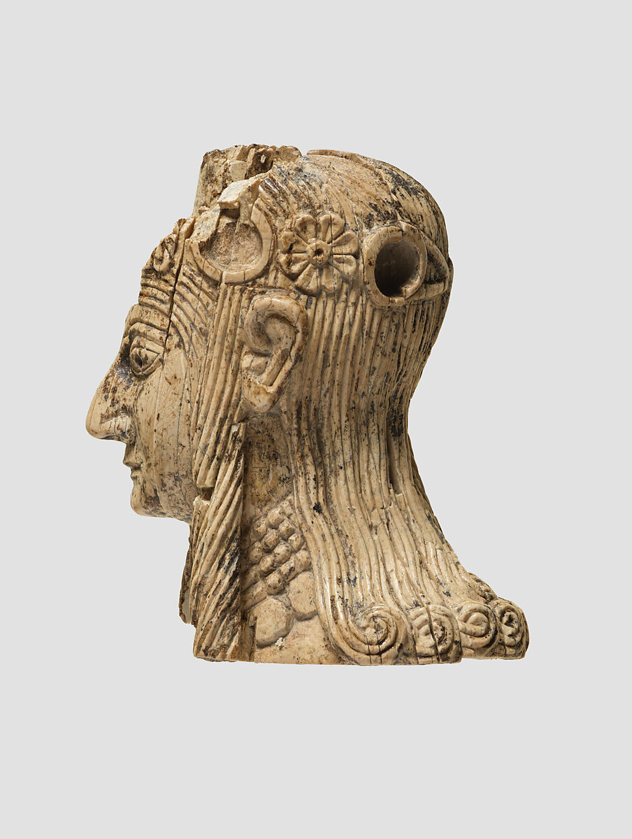 This female head, carved in the round, was found in the Burnt Palace at Nimrud and may have originally been part of a composite statuette made of various materials and overlaid with gold foil. A square mortise cut into the bottom of this piece suggests that a tenon would have secured it to a now lost body. Part of the head has been damaged, but several features that remain, including the large, originally inlaid eyes, prominent ears, hooked nose, small mouth, and receding chin, are characteristic of North Syrian ivories. The hair falls in long individual locks, crowned by a diadem of rosettes and inlaid discs (the original colored glass or semiprecious stone inlays are now lost) tied at the back of the head. The choker-style necklace with pendants worn by this female figure is similar in form to those worn by the female figures depicted on an ivory handle also found in the Burnt Palace and in the Metropolitan Museum’s collection (MMA 52.23.2).