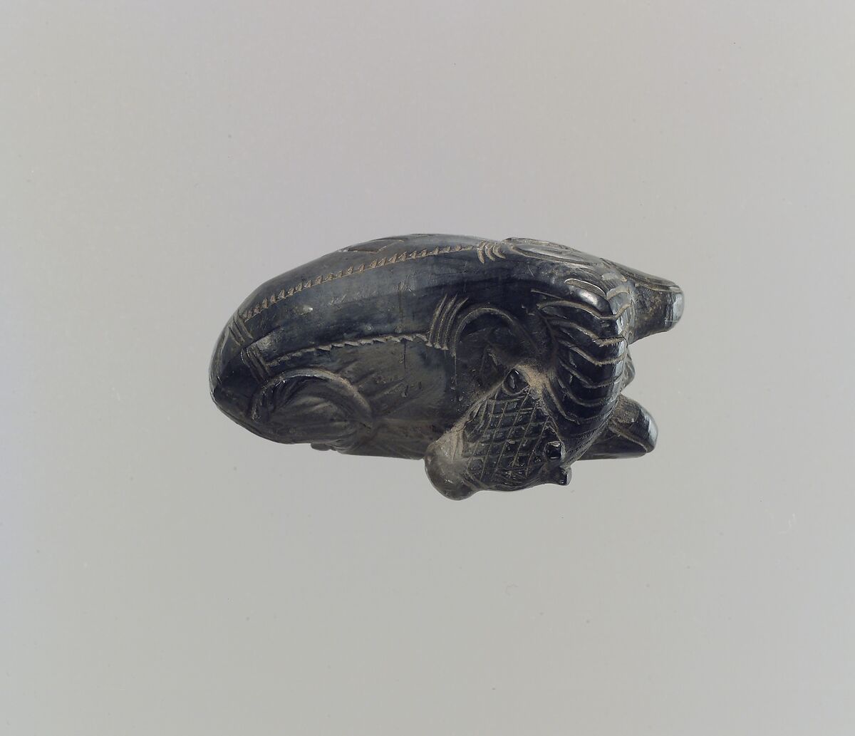 This small ivory figurine depicting a resting calf was probably blackened through exposure to fire when the palace complexes at Nimrud were sacked during the final defeat of Assyria at the end of the seventh century B.C. The bottom of the figurine is flattened and has a rectangular hole, into which a peg could be inserted as a means to attach the calf to another object. It was likely attached to the lid of a pyxis, a small round box used for precious goods including luxurious commodities such as spices, incense, cosmetics, perfumes or ointments. A fragment of such a lid, decorated with attached ivory calves and flower buds, was found in the Burnt Palace, where this calf was excavated, along with several additional calves with markings similar to this one. Another ivory lid from the Burnt Palace, which is carved with a rosette in relief and drilled with dowel holes used to attach elements, is in the collection of the Metropolitan Museum (54.117.9).