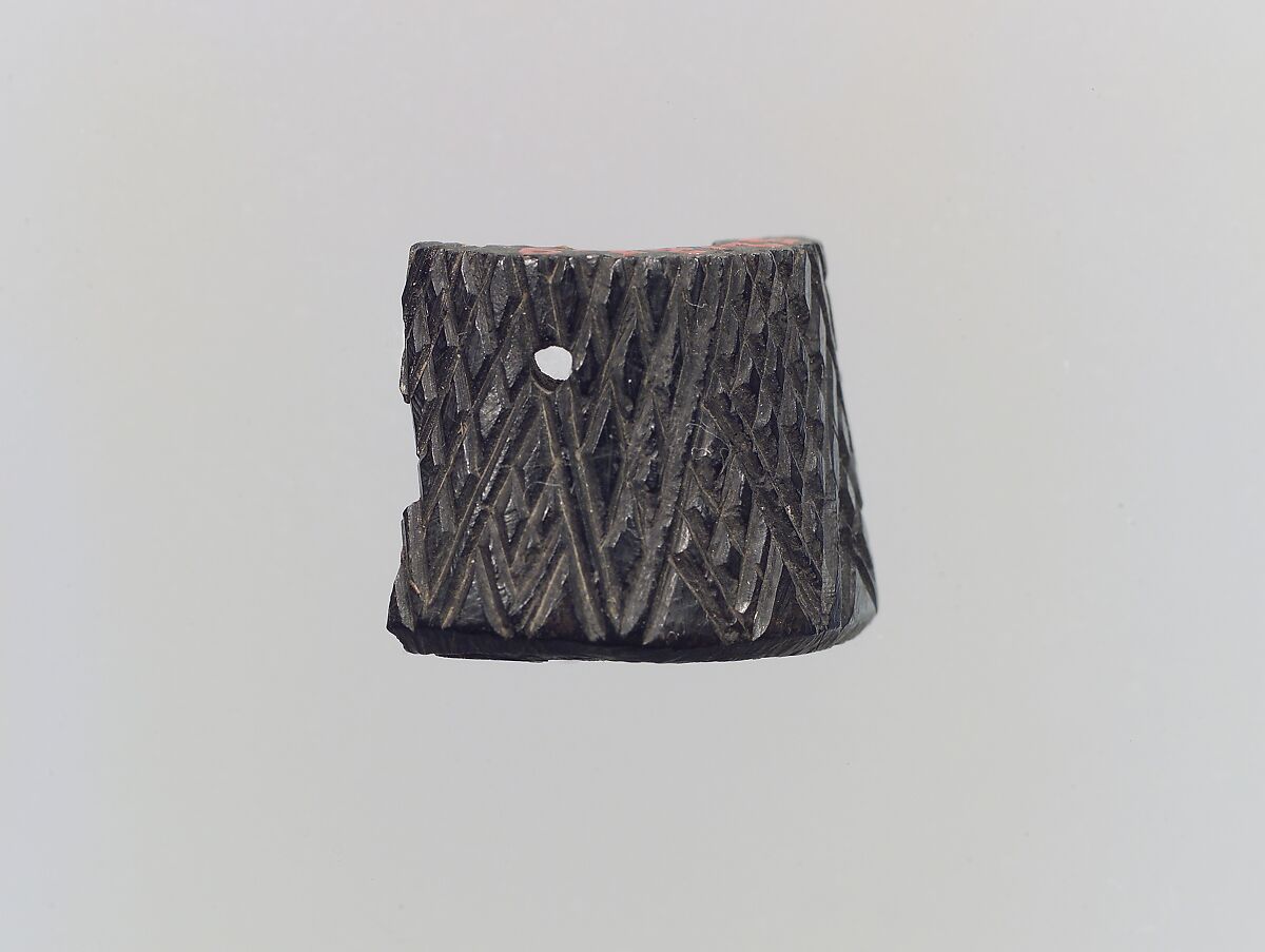 This small ivory fragment is rounded in shape and was probably blackened through exposure to fire when the palace complexes at Nimrud were sacked during the final defeat of Assyria at the end of the seventh century B.C. It is incised with overlapping triangles filled with cross-hatched decoration and outlined by a single-line border. A hole drilled through the piece horizontally may have allowed it to be attached to another element by a nail or peg. Carved ivory pieces such as this were widely used in the production of elite furniture during the early first millennium B.C. They were often inlaid into a wooden frame using joinery techniques and glue, and could be overlaid with gold foil or inlaid with colored glass or stone pieces to create a dazzling effect of gleaming surfaces and bright colors. This piece is too broken to reconstruct its original appearance, although its cylindrical form suggests it may have formed part of a decorative column.