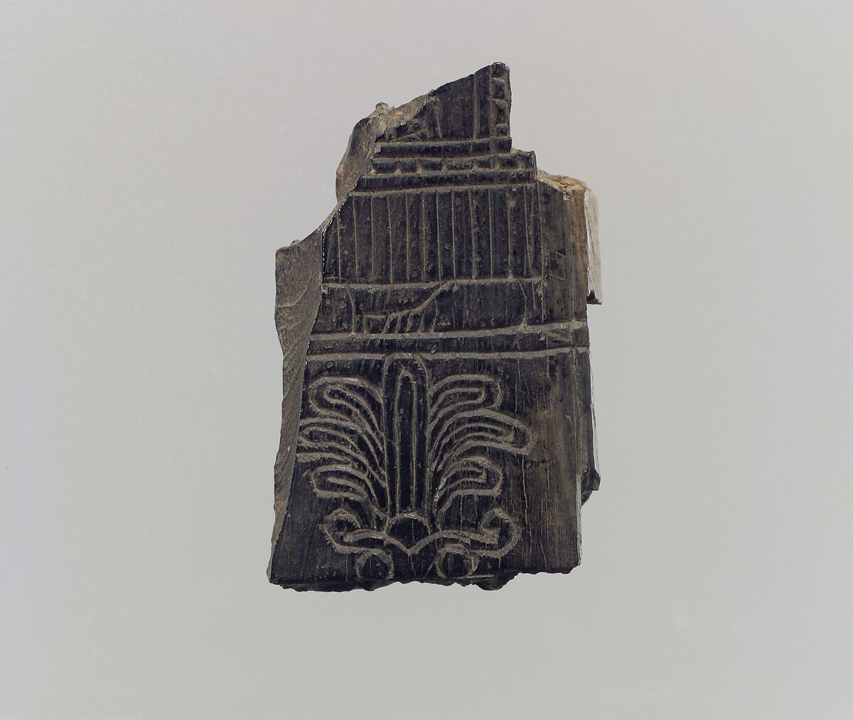 This small ivory fragment was probably blackened through exposure to fire when the palace complexes at Nimrud were sacked during the final defeat of Assyria at the end of the seventh century B.C. A stylized palmette is depicted at the bottom of the fragment, below a plain border. Above, the foot of a figure wearing a long garment with fringed border can be seen; to the left, the heel of the figure’s other foot is still preserved. The original composition was probably similar to other Assyrian carved ivories and reliefs that show processions of court officials and foreign dignitaries bringing tribute to the king. Carved ivory pieces such as this were widely used in the production of elite furniture during the early first millennium B.C., and were often inlaid into a wooden frame using joinery techniques and glue. Ivories carved in this style, in which scenes similar to those depicted in the stone reliefs decorating the walls of the Assyrian palaces are represented using an incised technique, are thought to have been made in Assyrian workshops for the use of the royal court.