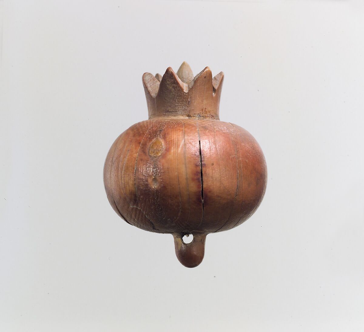 This small ivory pomegranate is carved in the round, with a pointed calyx, the floral element that protects the developing flower at top, and a thin stem projecting from the bottom. It was found in a well in the Northwest Palace of Ashurnasirpal II, where it was probably thrown when the palace was sacked, perhaps during the final defeat of Assyria at the end of the seventh century B.C. Its warm, reddish color, although appropriate for a pomegranate, is actually a stain on the surface of the ivory from long exposure to well water or sludge. The horizontal perforation where the stalk meets the skin suggests that this piece was sewn onto a garment or suspended from a diadem. Symbols of fertility because of their many seeds, pomegranates were favored as decoration on the clothes and jewelry of royal Assyrian women. Pomegranate beads are depicted strung onto necklaces and embroidered on the robes and crowns worn by the figures in the reliefs lining the walls of the Northwest Palace. They are also shown hanging from the diadems worn by women in several carved ivories from Arslan Tash and Nimrud in the Metropolitan Museum’s collection (MMA 54.117.8, 57.80.11, and 57.80.12).