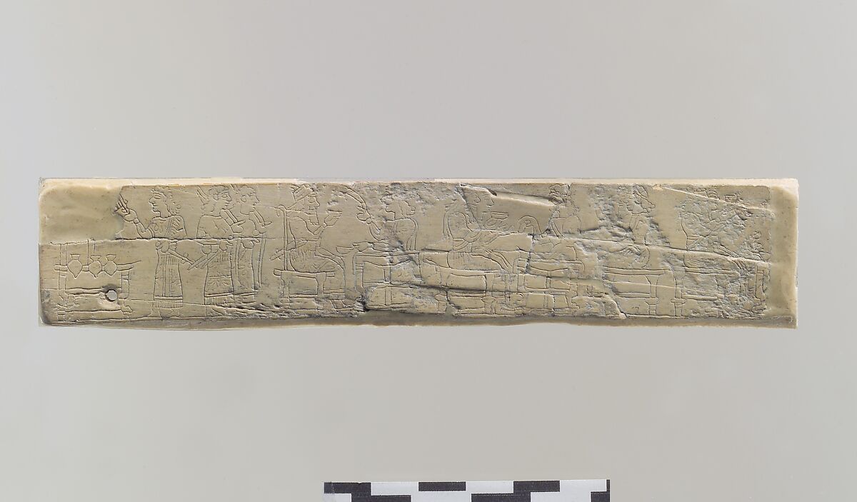 This long, narrow strip of ivory is broken at both ends, but enough remains of the decoration to identify it as a scene depicting a royal banquet. At left, a beardless attendant gestures to a stand holding three pots, perhaps serving vessels for the meal; he may be waving a fan over the pots to keep insects away. Two similar figures stand to the right, armed with bows, and face the back of the seated king, who is identified by his distinctive hat—a fez-like cap topped by a small cone. The king is bearded and seated on a throne with a high back. He holds a bowl on the fingertips of his right hand and faces another beardless attendant, who holds a long-handled cup or dipper and waves a whisk toward the king. The attendant stands behind a three-legged table covered with a cloth. To the right is another group of banqueters, this time arranged in two seated pairs consisting of a bearded and a beardless figure, which face each other across another three-legged table. Behind the table stands another beardless attendant, who hands something to the left-hand pair. The bearded figure in this pair wears a diadem and holds a bowl with the fingertips of his right hand, like the king. The diadem and gesture suggest that he has a higher status than the other figures in his group, and should probably be identified as the crown prince. At the right edge of the strip, part of an additional banqueting group can be seen, although the damage to the piece makes it difficult to make out their features and attributes. One of the figures raises a cup or bowl. One leg of a three-legged table can be seen right before the break. Carved ivory pieces such as this were widely used in the production of elite furniture during the early first millennium B.C., and were often inlaid into a wooden frame using joinery techniques and glue. Ivories carved in this style, in which scenes similar to those depicted in the stone reliefs decorating the walls of the Assyrian palaces are represented using an incised technique, are thought to have been made in Assyrian workshops for the use of the royal court. This piece was found in Fort Shalmaneser, a royal building at Nimrud, in an area probably used as a royal residence. Most of the carved ivory found in the royal residence area at Fort Shalmaneser was carved in the Assyrian style, suggesting that the Assyrian court primarily used ivory furniture carved in this style.