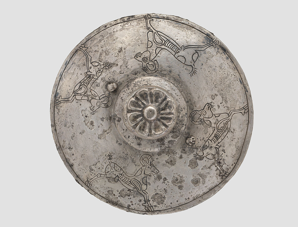 This boss, a type of raised ornamentation, is decorated with four incised ibexes and a knob in the center ending in a rosette. Its function is uncertain but a riveted loop at the back may indicate that it could have been used as horse harness decoration.