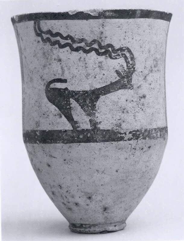 This beaker has a narrow, flat base, straight sides, and an everted rim. It is made of buff clay, with painted brown decorations. These decorations feature a horned animal with a stylized body, a long neck, a curled tail, and undulating horns that extend to the rim. Wheel lines on the interior indicate that it was made on a potter’s wheel.