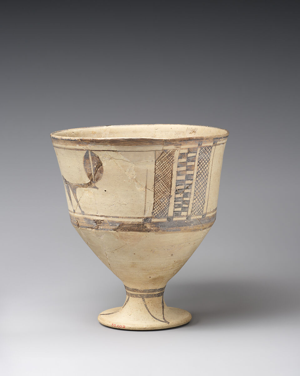 This goblet has a flat base, straight sides, and an everted rim. It is made of buff clay, with painted brown decorations, including crosshatching and checkerboard patterns. These decorations also feature an animal with a stylized body, a long neck, a drooping tail, and crescent-shaped ears that extend to the rim. Wheel lines on the interior indicate that it was made on a potter’s wheel.