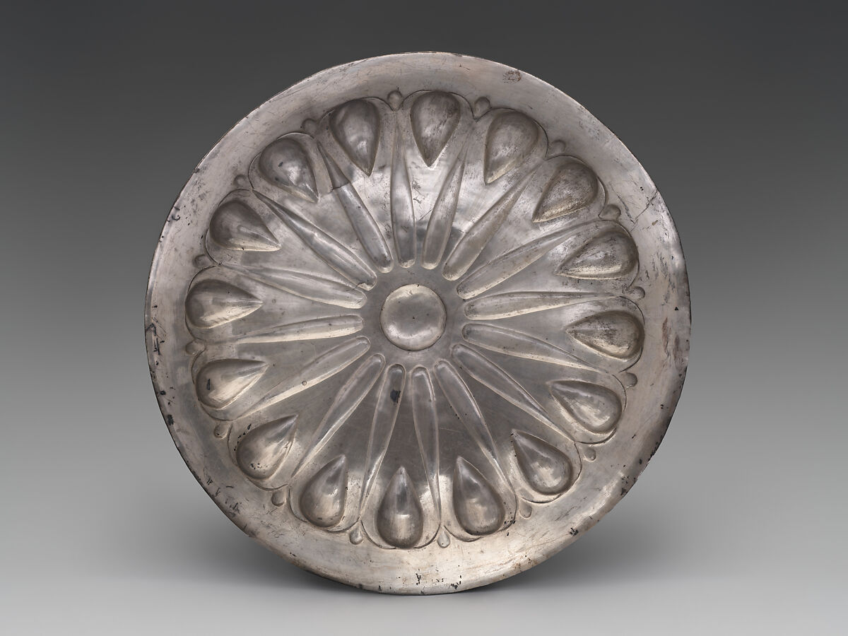 This silver drinking vessel is conventionally called a phiale (plural phialai), an ancient Greek term for any wide, shallow bowl. It has a carinated, or ridged, shoulder and a turned-out rim. In the center of the bowl is a raised boss, usually referred to by the Greek term omphalos, surrounded by sixteen depressions. Between the depressions are deep, rounded lobes, or gadroons. The vessel was made by raising and sinking a single sheet of metal, and then adding chased details, a method that was employed for most Achaemenid metalware.