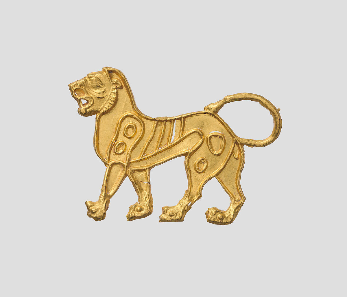 This gold applique depicts a lion striding to the left. Its mouth is open, and its tail curls back to meet its rump. Several apertures on the lion’s shoulder and hind legs probably once held inlays. There are loops on the reverse side of the applique for attaching it to fabric.