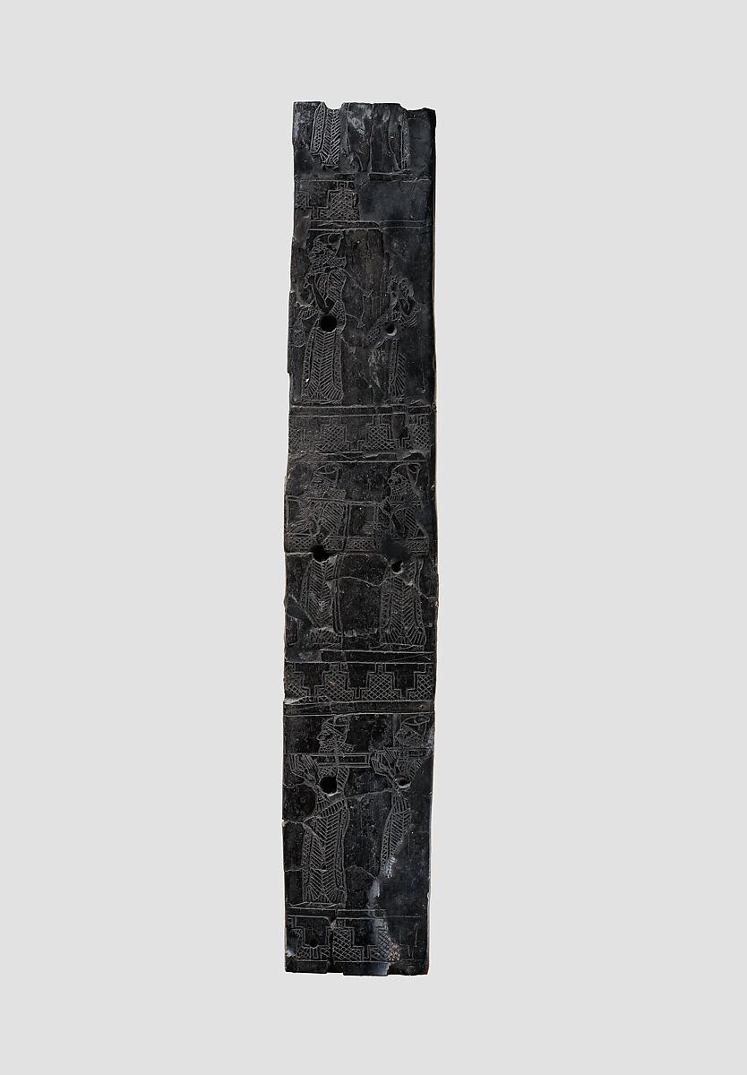 This strip of ivory was probably blackened through exposure to fire when the palace complexes at Nimrud were sacked during the final defeat of Assyria at the end of the seventh century B.C. It depicts three registers of figures in procession to the left, and the bottom half of a fourth, divided by decorative borders in the form of stepped crenellations, which are projections that lined the tops of defensive walls. The figures are bearded and wear long robes and rounded caps. They carry offerings, presumably to the Assyrian king and court. Only the elaborate robe of one of the figures on the top register can still be seen; below, two figures carry wineskins over their shoulders and smaller bags at waist height; in the bottom two registers, the figures carry what appears to be furniture. Carved ivory pieces such as this were widely used in the production of elite furniture during the early first millennium B.C., and were often inlaid into a wooden frame using joinery techniques and glue. Ivories carved in this style, in which scenes similar to those depicted in the stone reliefs decorating the walls of the Assyrian palaces are represented using an incised technique, are thought to have been made in Assyrian workshops for the use of the royal court. This piece was found together with other carved ivory fragments in the same style in the throne room of the Nabu Temple at Nimrud.