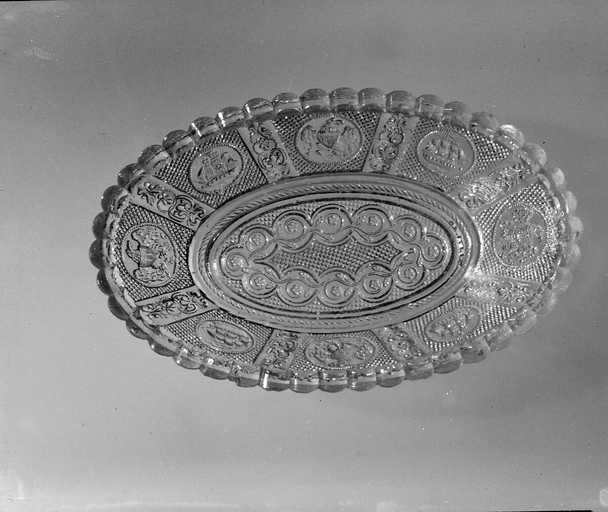 The design of the medallions pressed into the sides of this dish is called the "Eagle Constitution" pattern. The name probably refers to the Frigate Constitution, Oliver Wendell Holmes's "Old Ironsides." The threat of the Constitution's demolition in 1830, after over 30 years of combat service, occasioned a patriotic hue and cry. As a result, the ship was reconditioned in 1833. The dish dates back to the decade when the Frigate Constitution become a focus of national pride. The same pattern is also seen in a salt dish in the collection, 51.171.193.