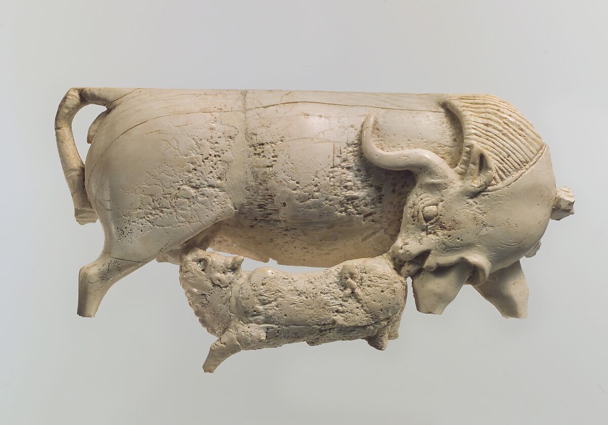 This fragmentary plaque depicts a cow suckling her calf and can be attributed to the South Syrian tradition of ivory carving. It combines the openwork technique, an aspect of the Phoenician style, with elements of North Syrian art, such as the cow’s large body. The cow turns her head, licking the tail of the calf. Her hair is detailed with incised lines and her large, curved horn rests against the upper body in low relief. The calf has rolls of baby fat on its throat and creases on its neck. A raised eyebrow accentuates its originally inlaid eye. The theme of a cow suckling a calf is commonly associated with fertility, and the circular composition of this plaque enhances this effect. Such an internal narrative is characteristic of Phoenician artistry. Two mortises cut into the roughened back of the plaque indicate that it may have been made to receive pegs for insertion into a piece of furniture. The absence of vertical frame elements suggests that this plaque was originally placed with similar pieces in a continuous frieze. Another openwork ivory plaque in the Metropolitan Museum’s collection with the same motif was found at the Neo-Assyrian capital of Nimrud (MMA 64.37.3).