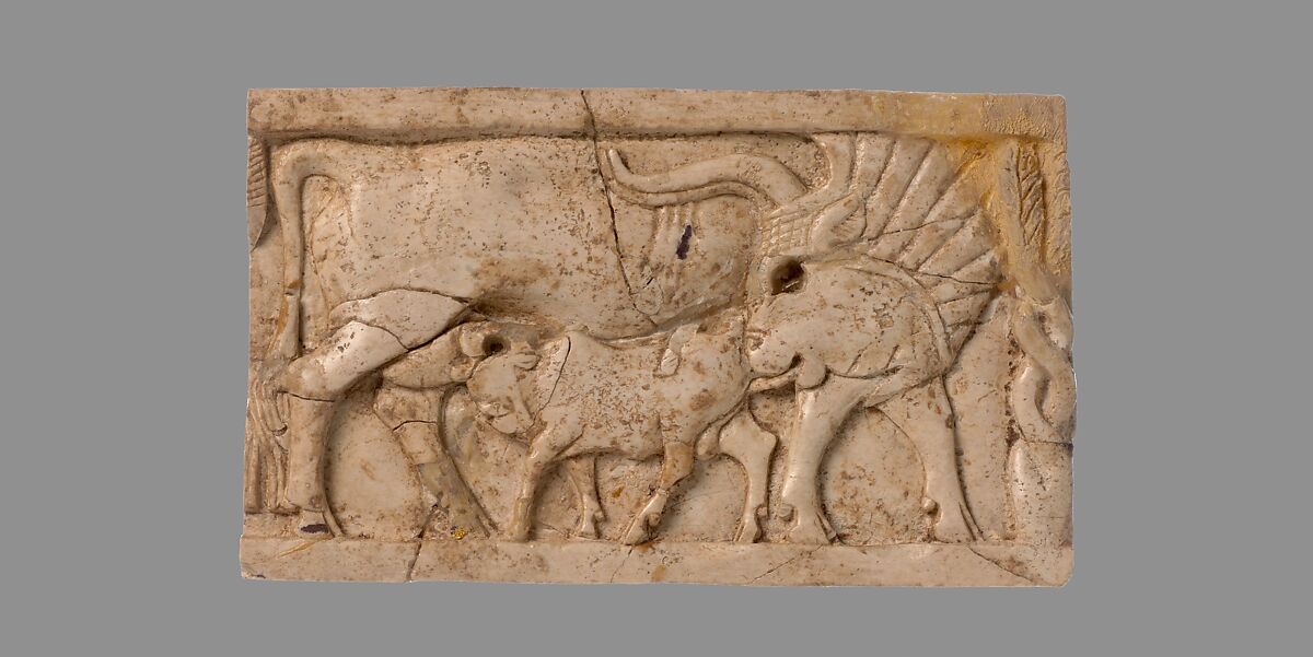 This rectangular plaque, carved in low relief, depicts a cow suckling her calf and is bordered by a thin band on the upper and lower edges. The scene is framed by vegetation that terminates in incised fronds, which stem from twisting stalks near the cow’s chest. The thick locks of hair are detailed with incised lines and two large, curved horns rest against the upper body in low relief. She turns and lowers her head, accented by a now lost inlaid eye, licking the tail of the calf she suckles. The plaque exhibits characteristics of the South Syrian style: the cow’s large body that presses up against the frame and the stylized vegetation draw upon North Syrian forms and combine with flowing lines characteristic of the Phoenician tradition. The theme of a cow suckling a calf is commonly associated with fertility. Two mortises cut into the roughened back of the plaque suggest that it may have received pegs for insertion into a piece of furniture. The absence of vertical frame elements indicates that it was perhaps placed side by side with similar plaques in a continuous frieze on the piece of furniture to which it originally belonged.