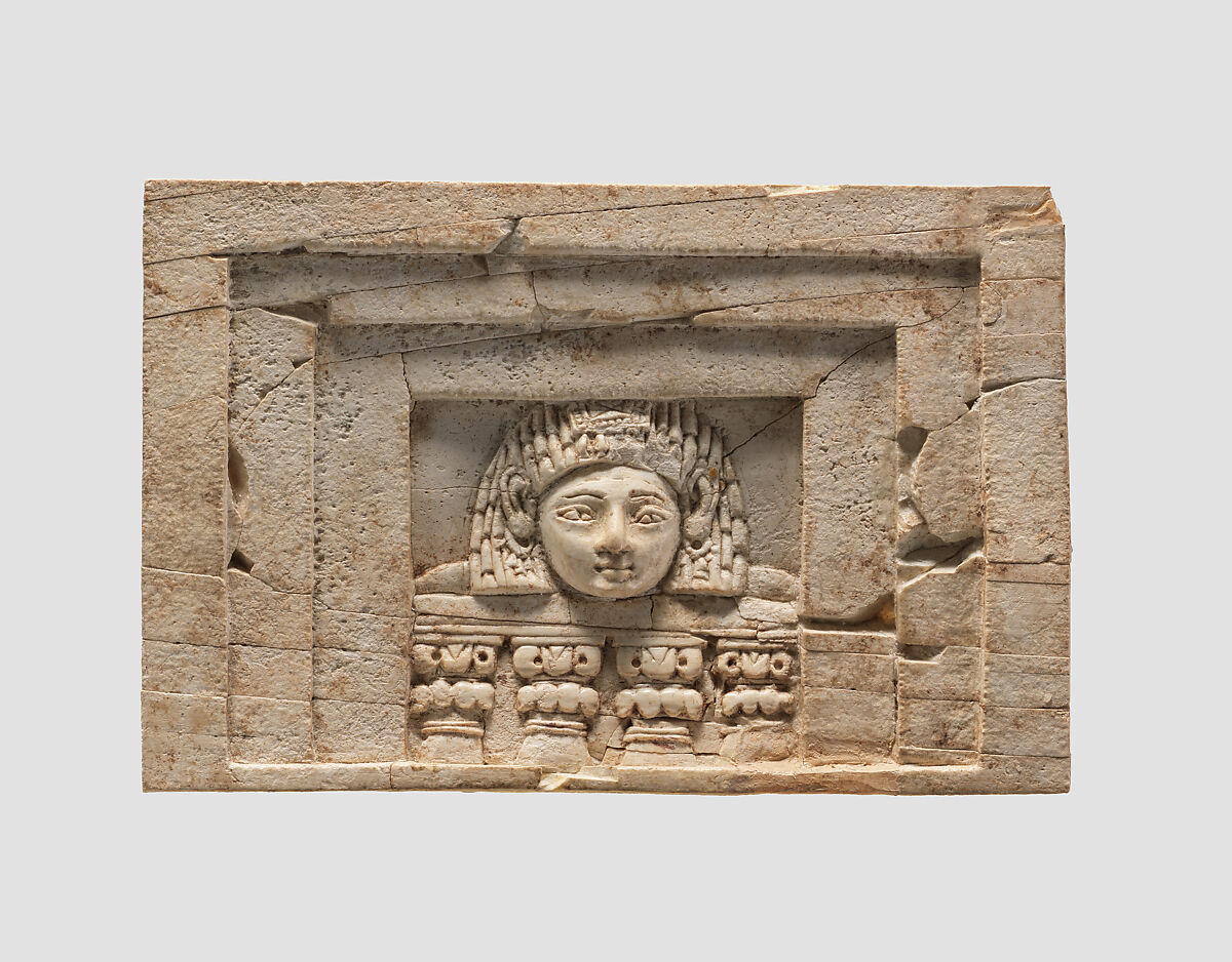 Depicted on this rectangular plaque is one of several variations of the “woman at the window” theme found at Arslan Tash and other sites in Mesopotamia and the Levant. The head of a female wearing a diadem and loop earrings is surrounded on three sides by a frame with two recessed bands. Below, four columns terminating in volute capitals support a balustrade. While such imagery appears to have a Phoenician derivation, this plaque can be attributed to the South Syrian style, expressed by a combination of North Syrian and Phoenician elements. Aspects of the North Syrian tradition include the woman’s large, round face, large ears, small mouth and receding chin. Drawn from the Phoenician style is the short, Egyptian-style wig. Two mortises cut into the roughened back of the plaque indicate that it was probably made to receive pegs for insertion into a piece of furniture. There is a West Semitic letter inscribed into the right side of the upper edge, probably as a guide for the assembly of the piece of furniture into which it originally belonged. There is no conclusive interpretation of whom these plaques were meant to represent; some scholars associate them with the Levantine goddess Astarte.