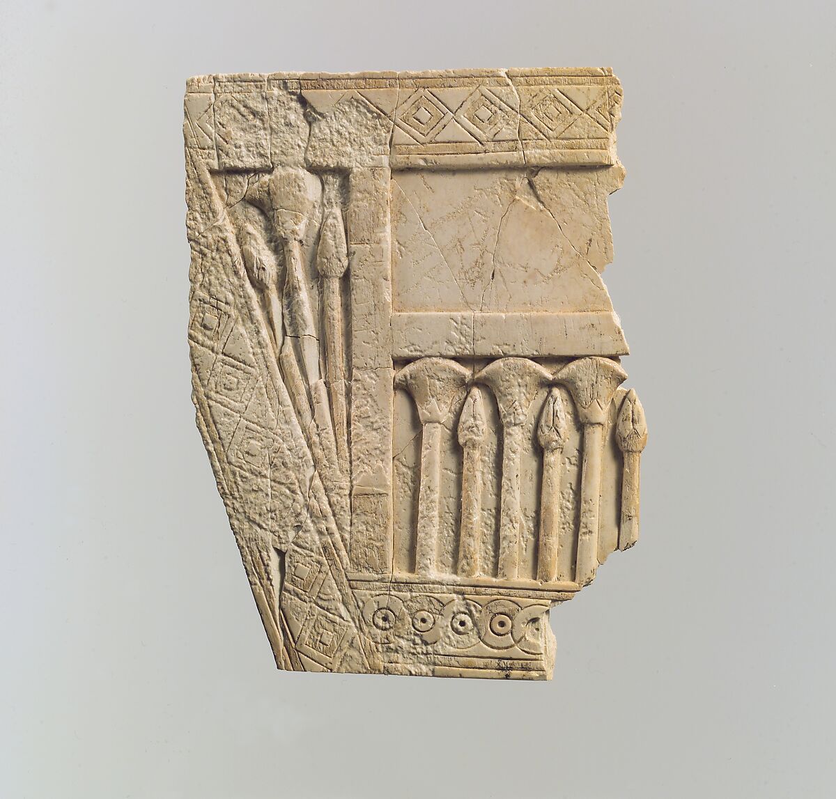 On this fragmentary, trapezoidal, low relief plaque, three papyrus flowers alternate with buds in a space framed by vertical and horizontal strips. The plaque is framed by wider strips incised with nested lozenges above and on one side, leaving a triangular space filled with a papyrus flower and two buds, and a guilloche pattern below. The Egyptianizing floral elements suggest that the plaque is carved in the Phoenician style. A mortise cut into the roughened back of the plaque indicates that it was likely made to receive pegs for insertion into a piece of furniture.
