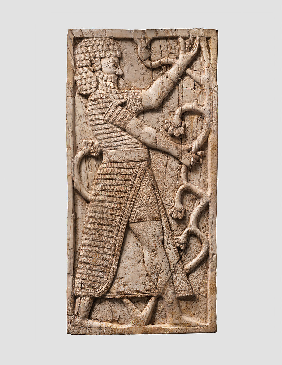 This ivory panel was found in a storage room in Fort Shalmaneser, a royal building at Nimrud that was used to store booty and tribute collected by the Assyrians while on military campaign. Like many other panels from the same storage room, it was part of a chair or couch back or the headboard of a bed. Twenty pieces of furniture were discovered stacked in orderly rows in this room, where they had been stored before the destruction of the Assyrian palaces in 612 B.C.