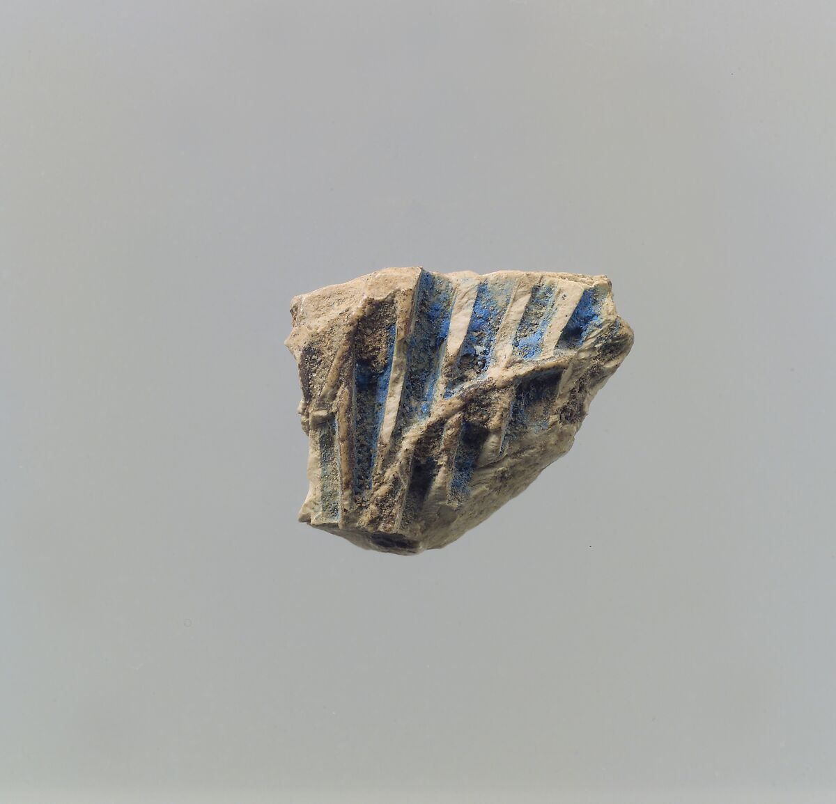 This small broken piece of ivory was originally part of a plaque. Carved ivory plaques were widely used in the production of elite furniture during the early first millennium B.C. They were often inlaid into a wooden frame using joinery techniques and glue, and could be overlaid with gold foil or inlaid with colored glass or stone pieces to create a dazzling effect of gleaming surfaces and bright colors. This fragment is made up of thin-walled carved cells, called cloisons, that were filled with colored inlays, although the traces of blue color that remain are left by the material that fixed the inlays in place rather than by the inlays themselves. When the royal buildings at Nimrud were sacked during the fall of Assyria in 614 and 612 B.C., looters stripped the gold inlay from the ivory furniture and left the broken pieces behind. This piece was probably part of a feathered wing belonging to a creature such as a sphinx or griffin, both of which appear frequently on ornately carved inlaid ivories.