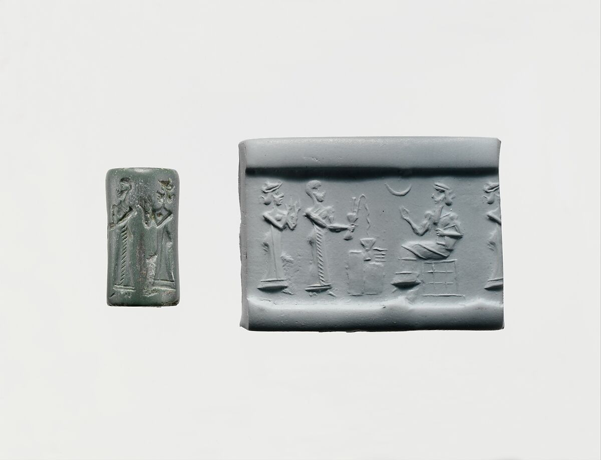 - Title: Cylinder seal and modern impression: worshiper pouring a libation before a seated god