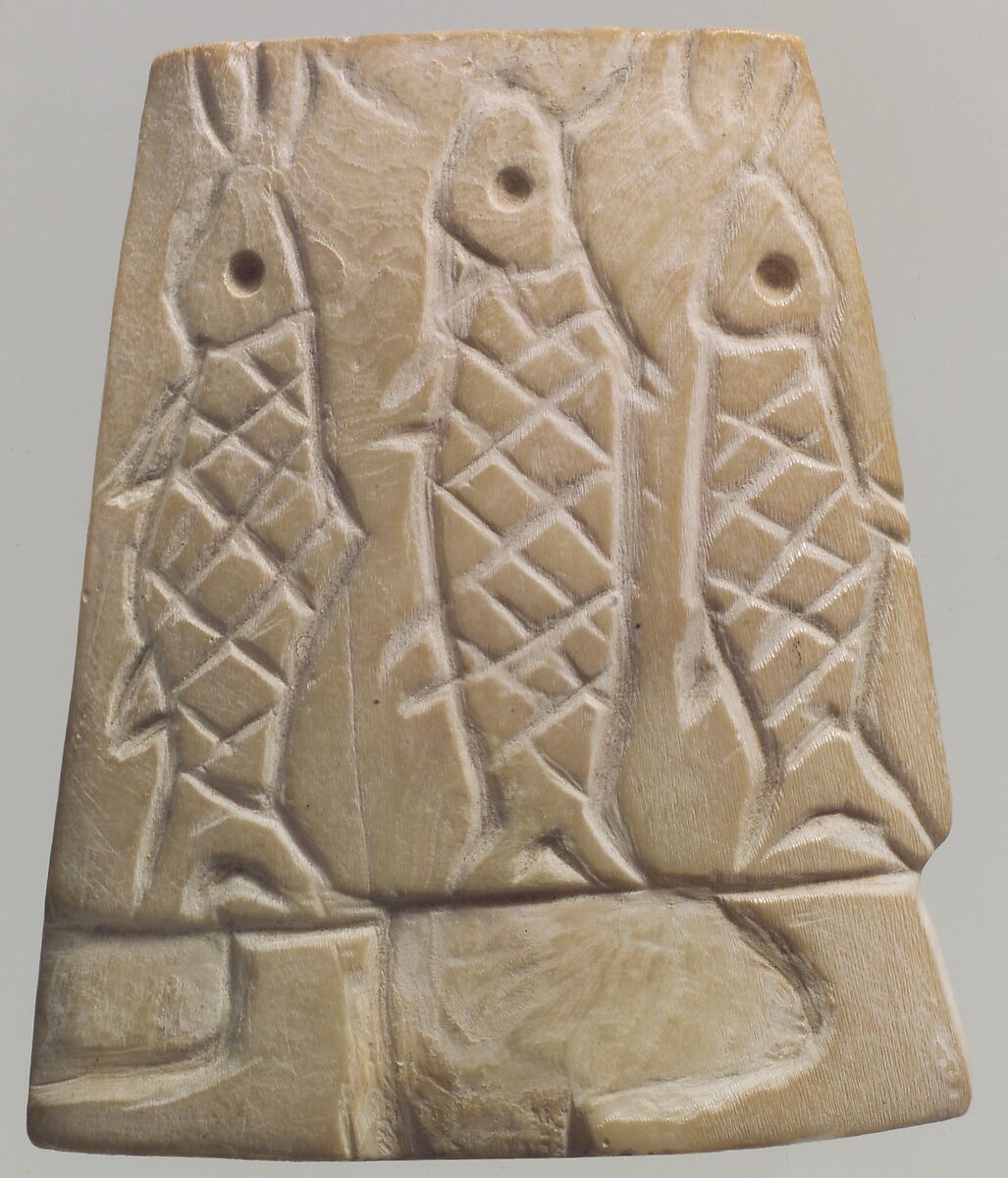 - Title: Inlay: skirt-clad figure carrying fish