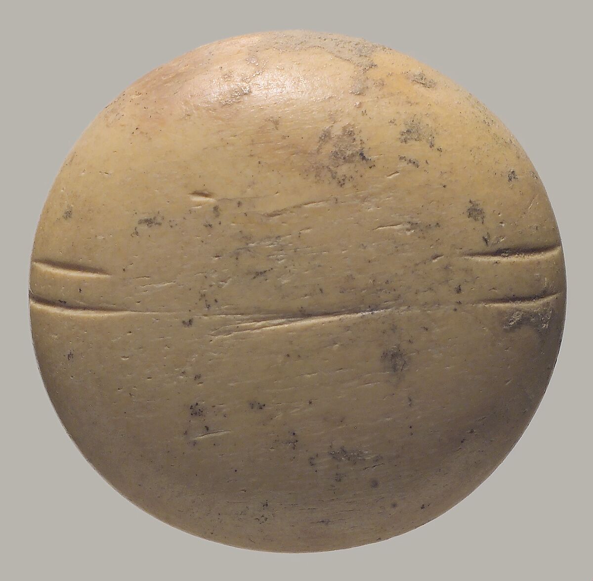 Objects such as this one can present problems of interpretation when they are not preserved as part of a set. Gaming accessories are rarely retrieved together with game boards. A game of 58 holes was discovered in association with three clay plano-convex discs in the area of the Enlil temple at Nippur. The discs, with the rounded side marked and the flat side plain, were presumably cast to determine the movement of the pieces along the board. They would have indicated a different value depending on the side, marked or unmarked, they landed. This bone disk from Nippur with two double incised lines on the edge may also have been used as a die. A great variety of dice—with two, like here, four, or six sides—have been used with race games in the ancient Near East.