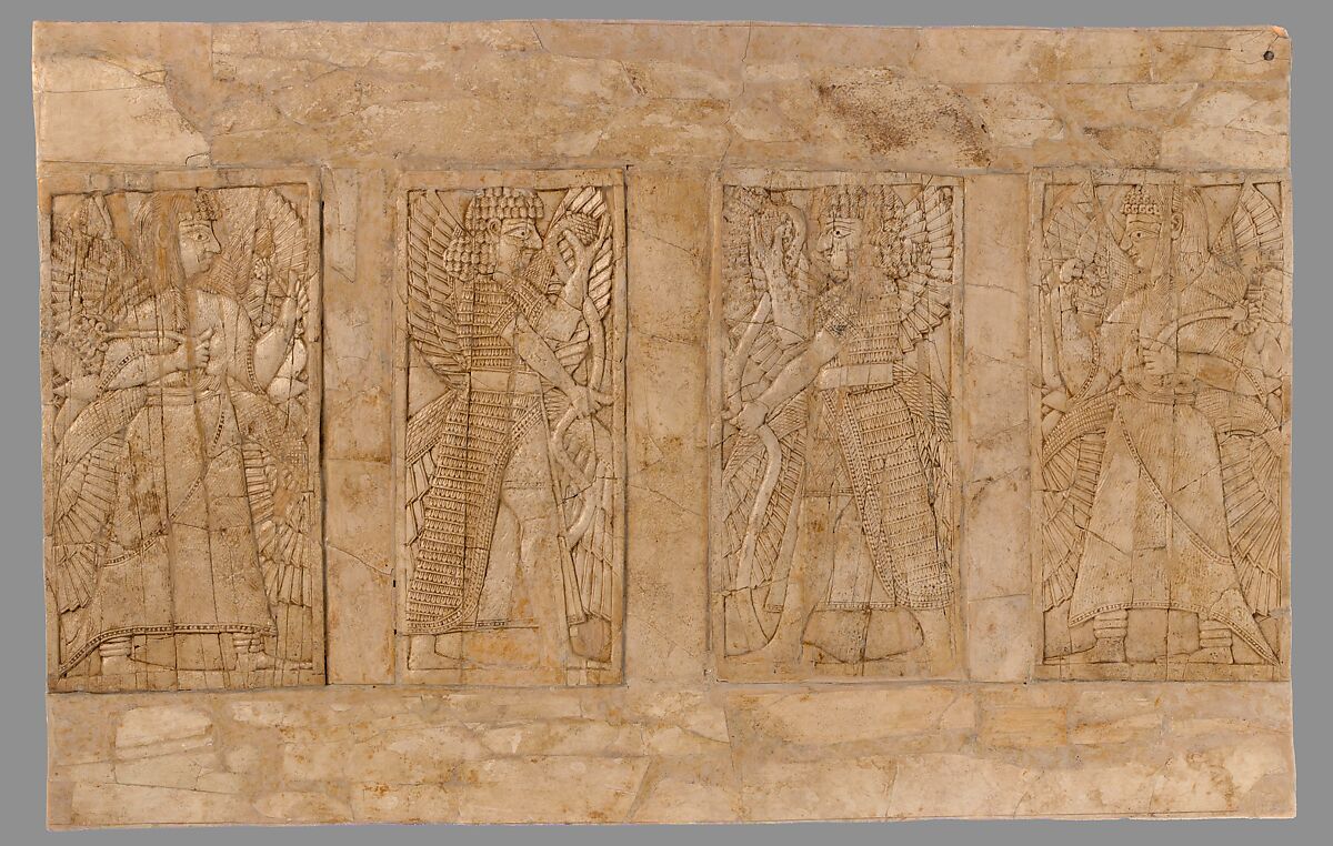 This piece combines plain flat strips of ivory with four panels depicting winged figures, two male and two female. The female figures wear their hair in long curled locks with a section of short curls at the front, and wear long dresses belted at the waist that reveal heavy anklets worn above bare feet. The male figures have shorter hair, worn as a mass of similar-length curls, and clean-shaven faces. They wear a long coat belted over a short skirt and are also barefoot. Both types of figures hold the curving stalks of plants in their hands. Since all are winged, they are likely intended to be supernatural figures, and their association with thriving vegetation may indicate that they embody concepts of abundance and fruitfulness. These panels are classified as North Syrian in style because of their carving technique; their dynamic composition, in which the image fills the entire frame; and the figures’ characteristic facial features, including large eyes and noses, small mouths, full cheeks, and receding chins. The excavator, Max Mallowan, noted that this panel was restored incorrectly, and that the two male figures should be on the outside rather than the inside. It was also probably curved, although it has been restored as a flat panel.