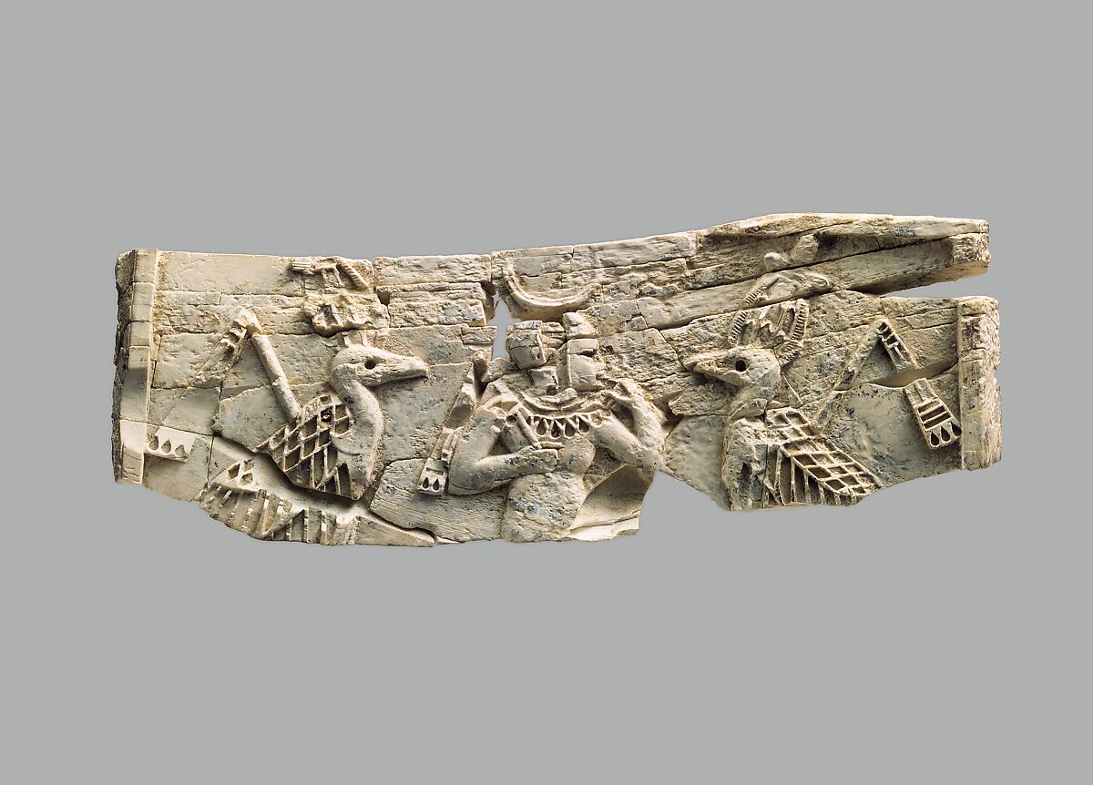 This ivory panel was found in a storage room in Fort Shalmaneser, a royal building at Nimrud that was used to store booty and tribute collected by the Assyrians while on military campaign. It depicts a seated child, probably the young god Horus, between two vultures. All three figures hold a ceremonial flail, a tool used to thresh grain, which was an attribute of the god Osiris and of the Egyptian king. The vultures wear atef crowns, a type of headdress worn by Osiris, while the young god is crowned by a sun disk, now fragmentary, and wears a heavy necklace called a broad collar. He wears his hair shaved with a single lock at the side, a style worn by Egyptian children. Carved ivory pieces such as this were widely used in the production of elite furniture during the early first millennium B.C. They were often inlaid into a wooden frame using joinery techniques and glue, and could be overlaid with gold foil or inlaid to create a dazzling effect of gleaming surfaces and bright colors. This piece is one of many elaborately carved ivories with motifs adapted from Egyptian art that have been attributed to Phoenician workshops, as Phoenician art shows strong Egyptian influence. The carved spaces in the eyes, the child’s hair, the vultures’ wing feathers, and elsewhere were originally inlaid in brightly colored glass or stone, in a style called "cloisonné" after the enameling technique of the same name.