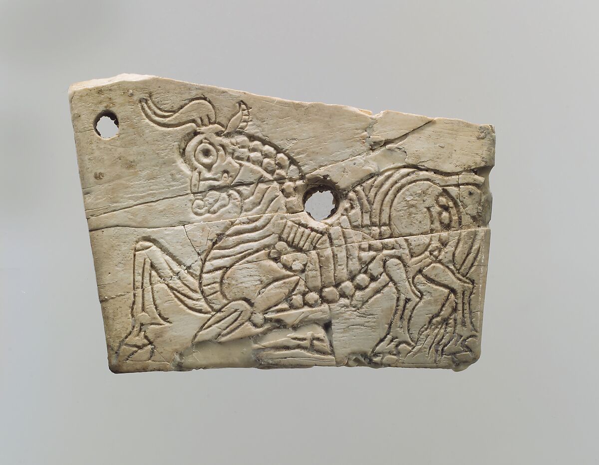 This trapezoidal plaque was found in a room that has been identified as part of the royal residency at Fort Shalmaneser, a royal building at Nimrud that was probably used to store tribute and booty collected by the Assyrians while on military campaign. Ivories with incised decoration like this one have been attributed to an Assyrian style similar to the large reliefs lining the walls of the Northwest Palace. The kneeling bull depicted on this plaque, with its stylized musculature and elaborately incised anatomy, recalls the animals embroidered on the robes worn by the figures in the palace reliefs and can be compared with depictions of animals in glyptic art and glazed ceramics from the Neo-Assyrian period. Two dowel holes that pierce the plaque were probably used to fasten it to a frame or other backing that does not survive. At Nimrud, Assyrian style ivories have been found in royal areas such as throne rooms and ceremonial or royal residential suites. The limited distribution of Assyrian ivories could suggest that their use and display was highly restricted.