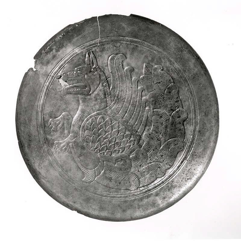 Close examination of the surface of the object indicates that the hybrid creature, known as a senmurv, is likely a modern embellishment to a Sasanian forged (not cast as previously thought) plate.
