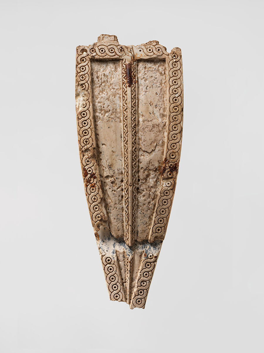 This ivory plaque was found in a storage room in Fort Shalmaneser, a royal building at Nimrud that was used to store booty and tribute collected by the Assyrians while on military campaign. Its roughly triangular shape indicates that it was used as a horse frontlet, a component of equestrian armor that covered the forehead of a cavalry horse. An incised decorative border runs around the edge of the frontlet, taking the form of a guilloche, or row of interlocking spirals and circles. The surface is undecorated and divided by a vertical raised ridge, triangular in cross-section, decorated on each face with a zig-zag pattern. At the top edge, the frontlet was connected to an additional piece via a hinge, which is no longer extant. Both pieces were probably attached to a separate textile or leather backing, also no longer preserved. The Assyrian cavalry was an important component of the empire’s armed forces, and mounted warriors as well as horse-drawn chariots are frequently depicted on the stone reliefs that decorated the rooms of the Assyrian palaces. Large quantities of carved ivory horse trappings, including frontlets, eye guards or blinkers, and bridle fittings, were found in the royal storerooms at Nimrud. Since ivory is a delicate material, these horse trappings may have been intended to be worn only on parade, not in battle.