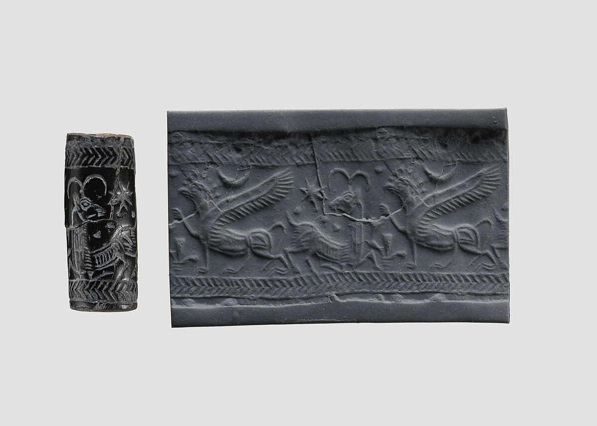 - Title: Cylinder seal (with pin preserved) with animal-monster contest scene