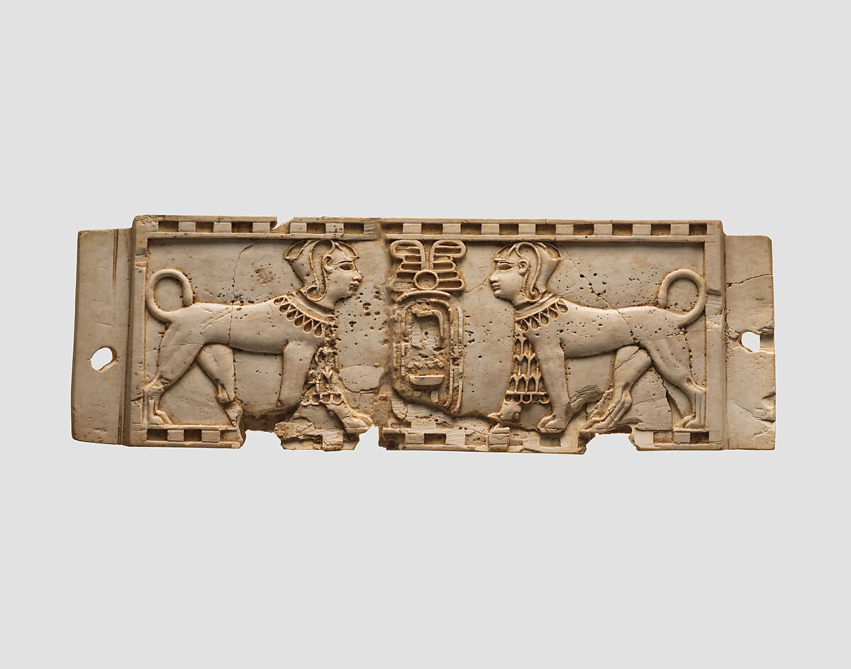 This rectangular plaque depicts two sphinxes flanking a central cartouche crowned by a solar disc and ostrich plumes. It was found in a large storeroom at Fort Shalmaneser, a royal building at Nimrud that was probably used to store tribute and booty collected by the Assyrians while on military campaign. Two tenons projecting from the shorter sides suggest that this piece was originally fitted into a frame, likely as part of a piece of furniture. The tenons are pierced by drilled holes for dowels that would have aided in securing the ivory to a frame. The piece is decorated in the cloisonné inlay technique, in which cloisons—walled cells—are cut into the surface and fitted with inlays of colored glass or semiprecious stones. None of the inlays have survived, in spite of the extensive cloisonné decoration on the upper and lower frames, the sphinxes’ hair, eyes, sidelocks, wesekh broad collars with pendant droplets, and hanging aprons. This plaque has been attributed to the Phoenician style, expressed by the slender leonine bodies of the sphinxes, the Egyptianizing cartouche, and the cloisonné inlay technique.