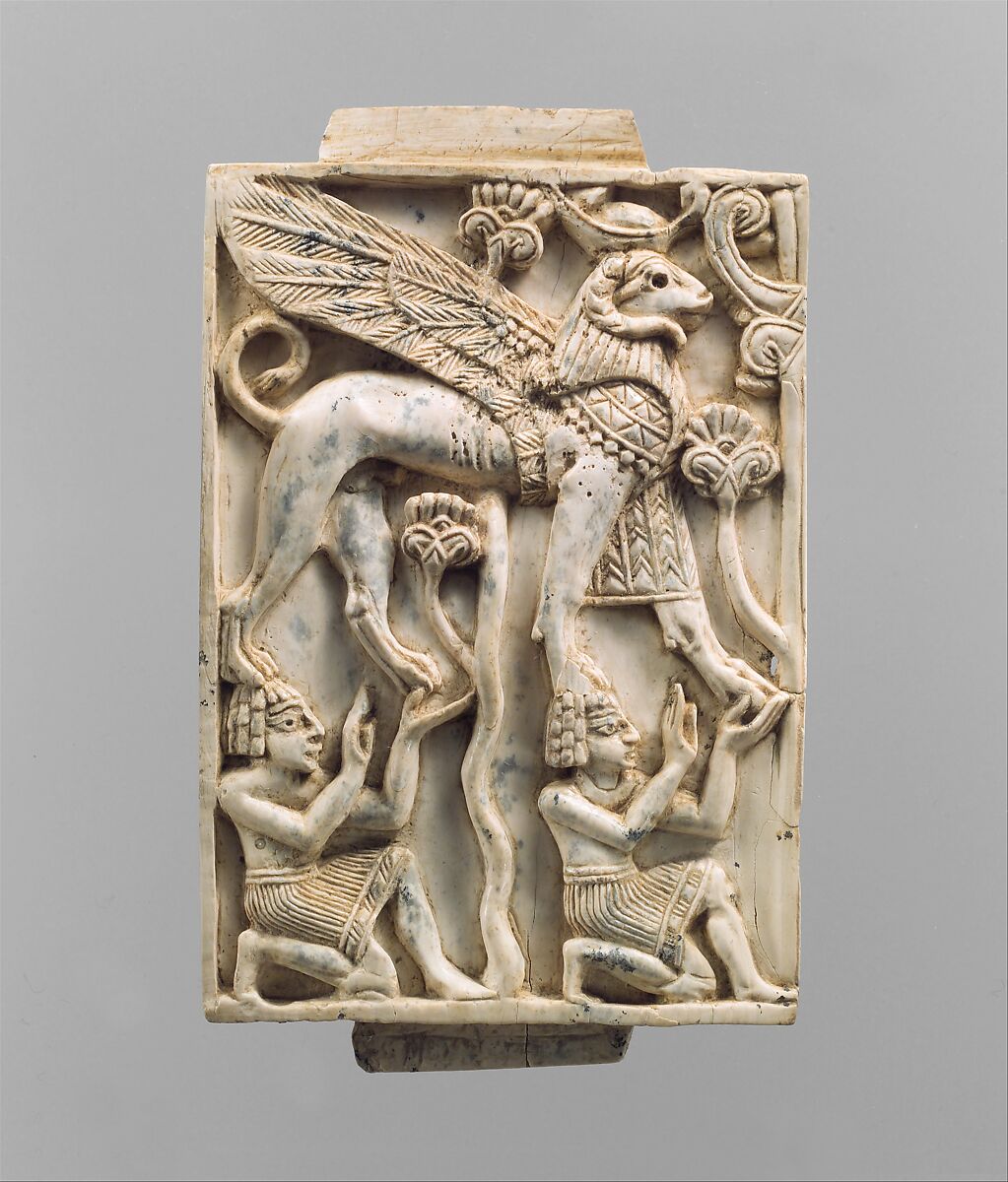 This rectangular plaque was found in a storeroom at Fort Shalmaneser, a royal building at Nimrud that was probably used to store tribute and booty collected by the Assyrians while on military campaign. It is carved in high relief with a winged, ram-headed sphinx striding to the right supported by the heads and upraised left palms of two kneeling male figures. The male figures raise their right hands with palms facing forward. A long, curving stalk with palmette flowers marks the center of the plaque, and a tree topped by volutes borders the scene on the right. A thin, raised border runs around the other three sides. The sphinx’s eye is deeply drilled to receive an inlay of colored glass or semiprecious stone that has not survived. Two tenons, preserved above the upper and lower edges, indicate that this piece may have been fitted into a frame, likely as part of a piece of furniture.