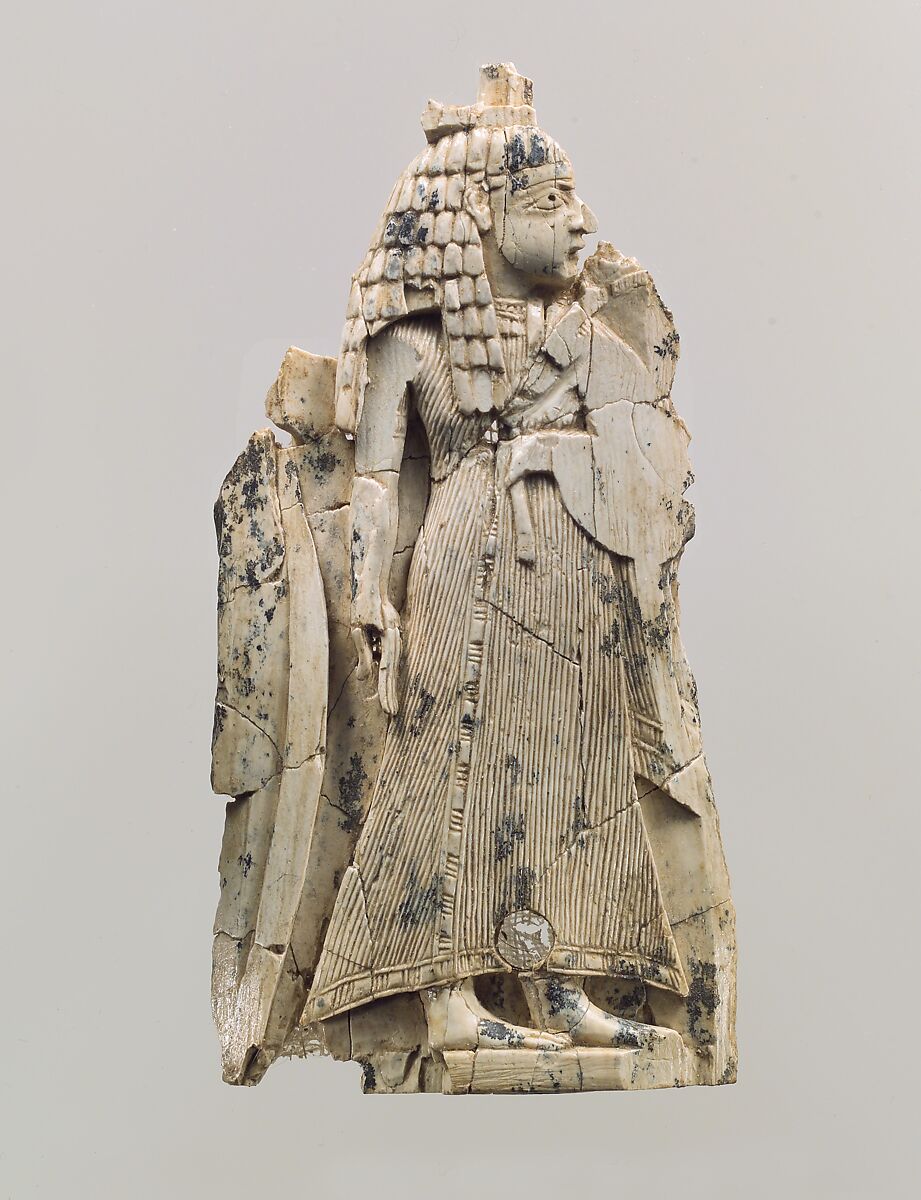 This piece was found in a storeroom at Fort Shalmaneser, a royal building at Nimrud that was probably used to store tribute and booty collected by the Assyrians while on military campaign. The fragmentary, rectangular plaque depicts a female figure with her head in profile facing right. She stands wearing a pleated, ankle-length garment that is fringed at the edges. Although her left arm is abraded, a floral stalk can still be seen held against her chest and may have originally extended in front of or over her left shoulder. The upper background behind the figure’s head does not survive. A circular hole drilled through the bottom of the robe suggests that the plaque was originally attached to a frame by means of a dowel and set into a piece of wooden furniture. The reverse has been roughened, probably to help glue join the surface of the plaque to the frame. Certain Egyptian features characteristic of Phoenician ivories, including the pleated garment and long, curly wig, are combined with facial features commonly found on North Syrian ivories such as the hooked nose, large eye, small mouth, full cheek, and receding chin. Because of this mixture of styles, this plaque has been classified as South Syrian, a style that occupies an intermediate place between the two.