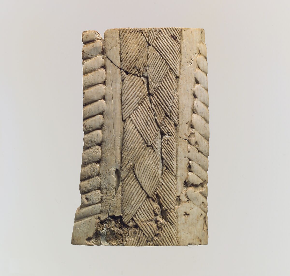 This plaque has a flat back and a raised surface, carved in relief with a central design resembling plaited hair or tufts of hair, bordered at each side with a plain strip and a fluted edge. It must have been part of another object such as a statue or piece of furniture, but was found as a fragment, making it difficult to reconstruct the original design. Carved ivory pieces such as this were widely used in the production of elite furniture during the early first millennium B.C. They were often inlaid into a wooden frame using joinery techniques and glue, and could be overlaid with gold foil or inlaid with colored glass or stone pieces to create a dazzling effect of gleaming surfaces and bright colors.