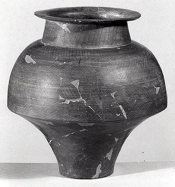 This biconical pottery vessel has a sharp edge around its middle where the two halves of the vessel were joined. It also has an abrupt shoulder and a wide, flaring rim. It is made of grey clay using a potter’s wheel, and decorated with several horizontal registers of hatching.
