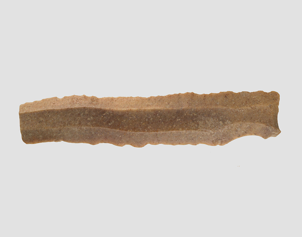 This chert blade was excavated at Yarim Tepe in northeastern Iran, six miles south of the modern town of Gonbad-e Kavus. Yarim Tepe was a small settlement, inhabited from the Neolithic to the Parthian period, with many interruptions. It probably dates to the late Chalcolithic period.