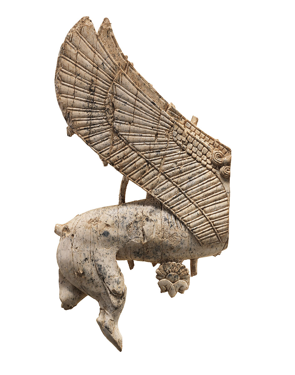 Found in a storeroom at Fort Shalmaneser, a royal building at Nimrud that was probably used to store tribute and booty collected by the Assyrians while on military campaign, this fragmentary plaque carved in the openwork technique depicts a winged, leonine animal, probably a sphinx, striding to the right. It was probably used to decorate a piece of wooden furniture. Two mortises cut into the preserved edge of the plaque on the right side suggest that the now-missing forepart of this hybrid creature, including its forelegs and head, was attached to the body by tenons. The lower hind legs have broken off. The floral stalks growing behind the sphinx’s body and the single palmette preserved below its chest suggest that this hybrid creature was originally depicted striding through a floral landscape. The elegant carving technique, seen in the individually articulated wing feathers and slender body, is characteristic of Phoenician ivories.
