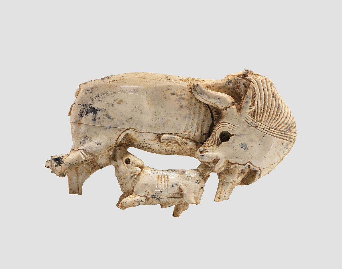 This fragmentary plaque depicts a cow suckling a calf. Carved in the openwork technique, characteristic of the Phoenician style, the lower legs of both animals do not survive. The cow’s raised, incised eyebrow accentuates an originally inlaid eye. Large ears and curved horns rest against the upper body in relief. The cow turns and lowers her head, detailed by carved dewlaps, licking the tail of the calf she suckles. Shallow incisions mark the ribs of both animals. Another openwork ivory plaque with the same motif found at Arslan Tash in Syria is also in the Metropolitan Museum’s collection (MMA 57.80.5).