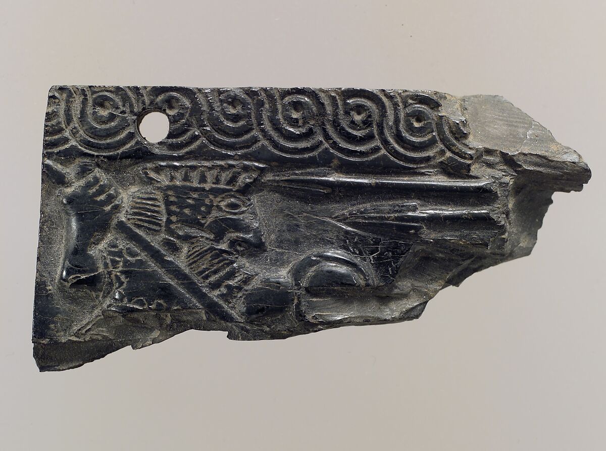 This fragment depicts a battle scene, with the upper body of a warrior at left holding a shield in his left hand and a spear aimed downward in his right. From the broken right edge of the fragment, two spears are pointed at the warrior’s head. His hair and beard are marked with a pattern of incised parallel lines, and his features are indistinct except for a large eye, shown in front view. His helmet has an earflap, marked with incised spots, and above is a flat projection decorated with triangular shapes, perhaps indicating a row of feathers. He wears a garment with scalloped borders visible at the edge of the sleeves and at the waist. The top and left edge of the plaque are unbroken, and a dowel hole pierces the guilloche border along the top edge. The plaque was probably attached to a wooden frame by means of dowels, to form a piece of furniture. A fragment showing a spear tip and the feet of two warriors, also in the Metropolitan Museum’s collection (65.123.18), may be part of the same plaque, or a similar plaque with the same type of decoration.