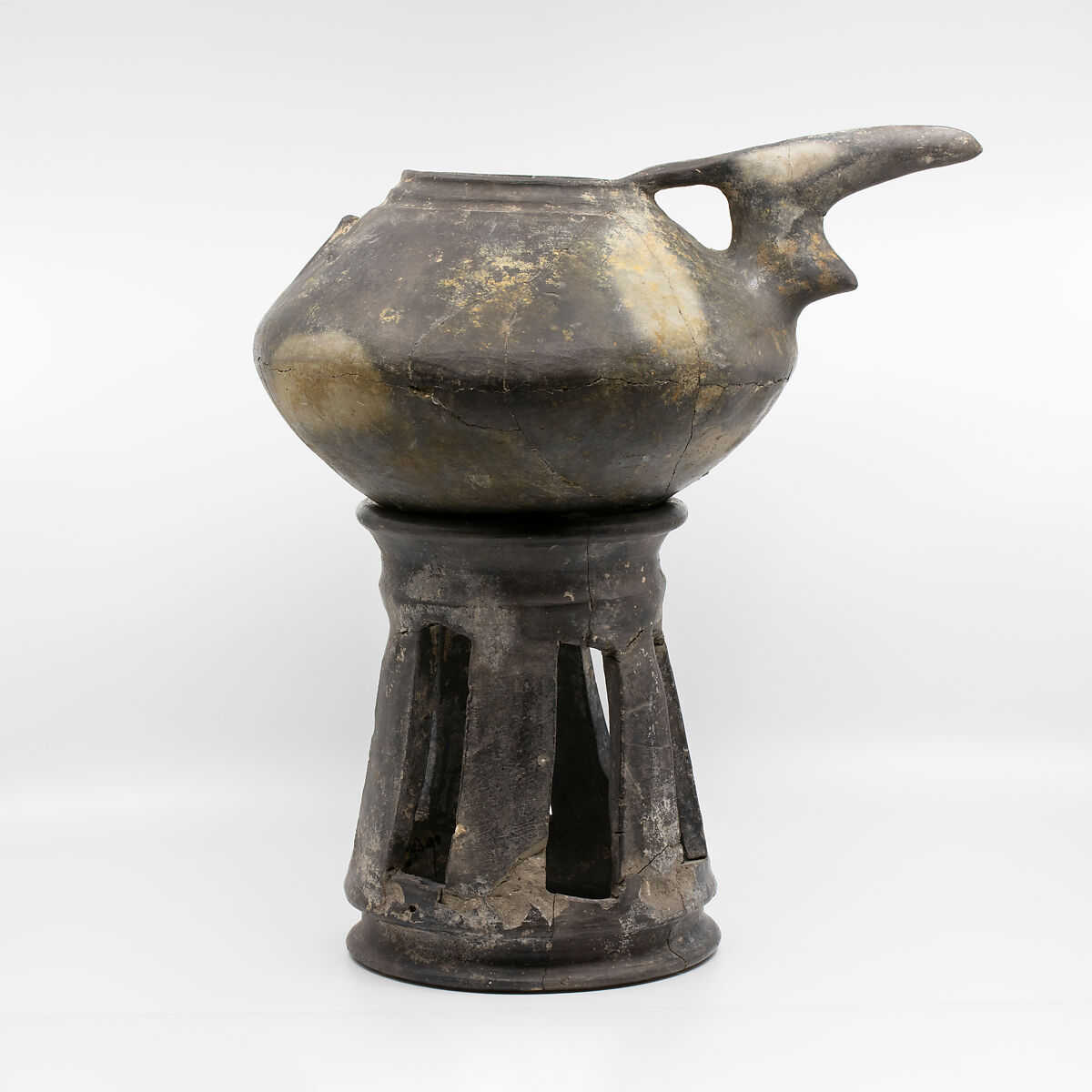 This biconical pitcher has a squat round body with a flat base. A pointed spout with an angled protrusion below it emerges from one side of the body. The spout is attached to the rim by a small bridge. It sits on a hollow cylindrical stand with a ring base and a collar at the top. The sides of the cylinder are open in horizontal strips. Both the pitcher and the stand are made of burnished grey clay. Both were made on a potter’s wheel. The pitcher was probably made in two halves that were joined together, with the spout added later.