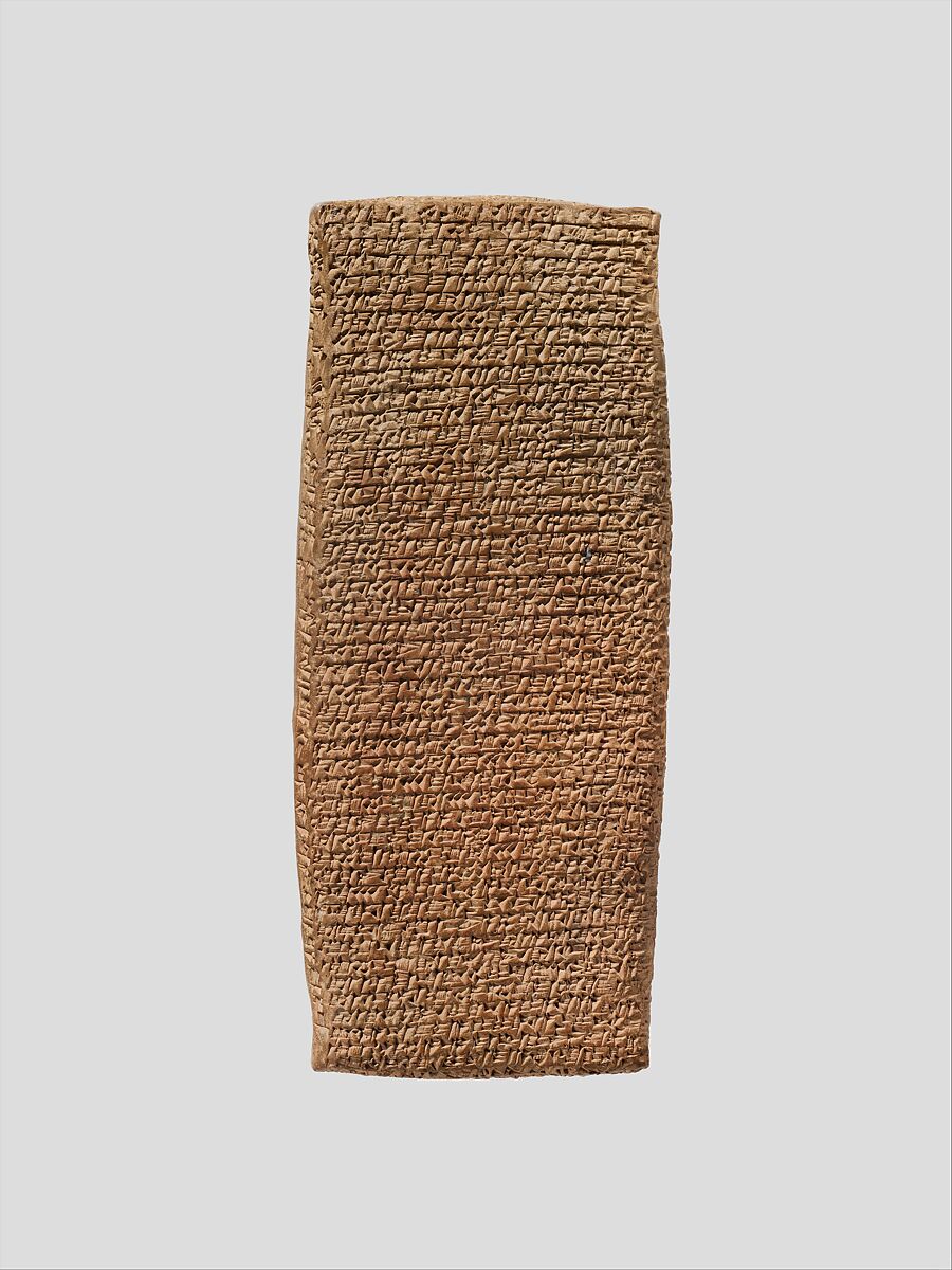 This tablet, the longest extant Old Assyrian legal text, represents one such document and records court testimony describing a dispute between two merchants. This testimony was delivered before witnesses representing the authority of the merchant government in Kanesh as well as the dagger of the god Ashur. In the text, Suen-nada and Ennum-Ashur accuse each other of stealing the valuable contents of a private archive which they both claim to own. Items within the archive include cylinder seals, tablets belonging to various named merchants, and tablets belonging to strangers that were deposited there for safe keeping. As undisturbed tablet storerooms are extremely rare, this text is important for reconstructing the contents of a sealed archive. Ennum-Assur calls for the case to be moved to Ashur to be tried in front of the city assembly and king, but unfortunately the verdict of the court is unknown. The tablet was contained in a clay envelope or case also in The Metropolitan’s collection (66.245.5b)