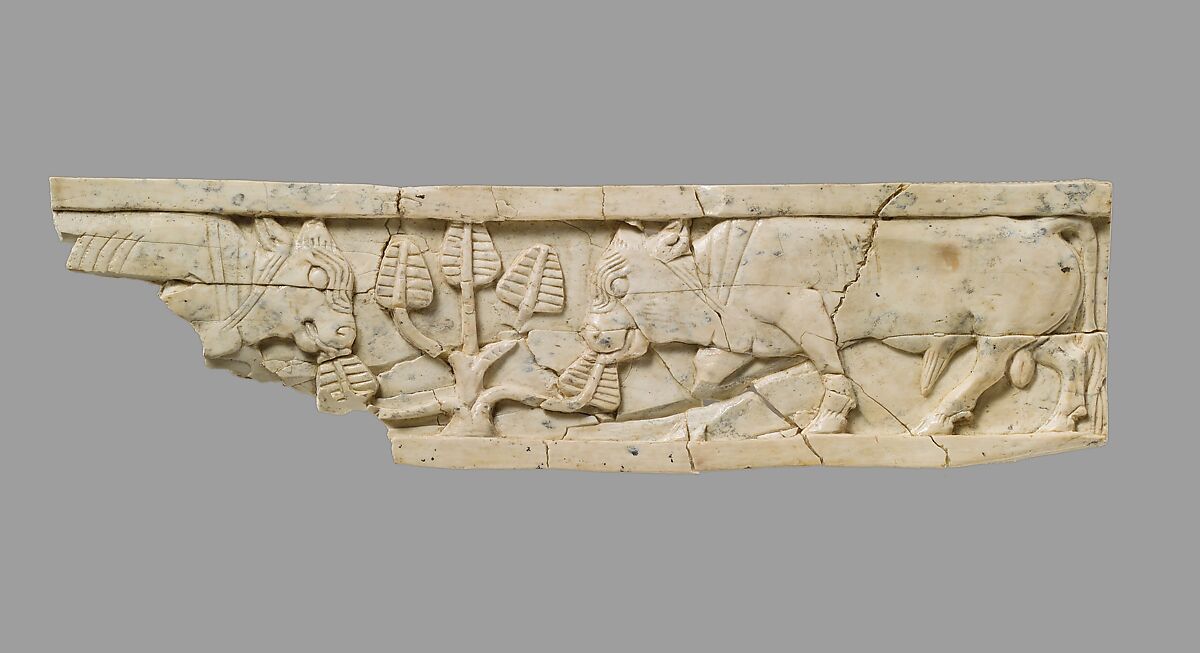 This carved ivory plaque was found in a storage room in Fort Shalmaneser, a royal building at Nimrud that was used to store booty and tribute collected by the Assyrians while on military campaign. It depicts a pair of bulls flanking a small tree, each nibbling at a leaf, framed above and below by a plain flat border. The five branches of the tree are arranged symmetrically and the leaves or fronds are decorated with horizontal ridges. Each bull’s ribs are defined by vertical parallel lines, and similar lines frame the eye and the muscular ridges on the back of the neck. Neither is depicted with horns. Because of damage to the plaque in antiquity, only the head and shoulders of the left bull are preserved, but the right bull is complete. The genitals are represented and the tail is slightly raised, but held in a relaxed position. Carved ivory pieces such as this were widely used in the production of elite furniture during the early first millennium B.C. They were often inlaid into a wooden frame using joinery techniques and glue, and could be overlaid with gold foil or inlaid to create a dazzling effect of gleaming surfaces and bright colors. Rows of bulls and cows with nursing calves, either carved in relief or in the openwork technique, have been found among the ivories collected by the Assyrian kings, including several other examples in the Metropolitan’s collection (< a href="http://www.metmuseum.org/art/collection/search/324331">54.117.10, 59.107.14, 64.37.3, 64.37.4, 67.22.6).