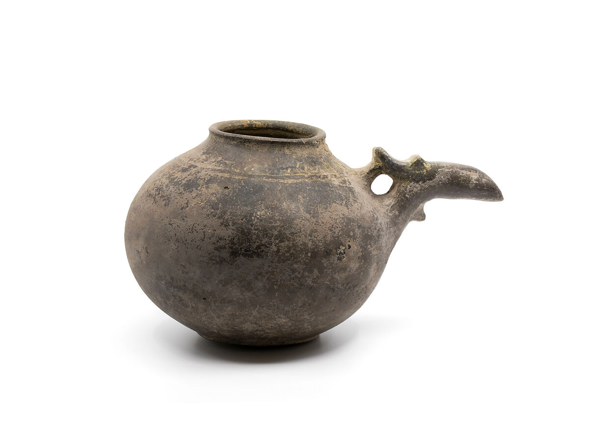 This pitcher has a globular body, a ring base and a rounded rim. A pointed spout emerges from the body of the pitcher at an angle before extending horizontally. The back of the spout is connected to the vessel by a bridge whose jointed shaped parallels that of the spout itself. Below the spout is a pointed projection. The combination of the pointed spout and projection below may suggest the form of a bird with a long beak and a crop in its neck. The pitcher is made of burnished grey clay. The body was likely made in two separate pieces on a wheel, with the spout added later.