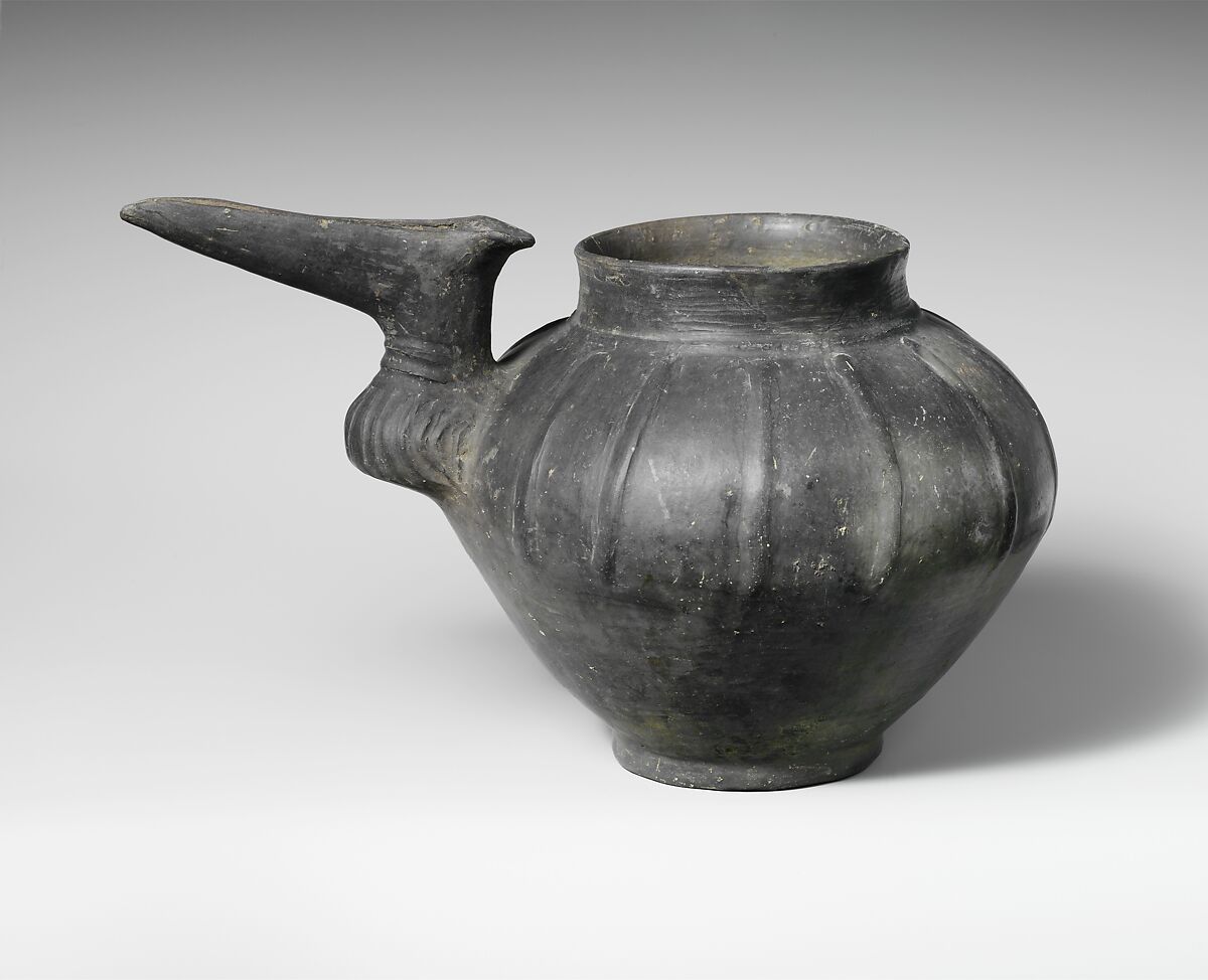 This pitcher has a globular body, a ring base, and a slightly flared rim. A pointed spout rises vertically from a protuberance on one side of the body before extending outward horizontally. Both the body and the protuberance supporting the spout are decorated with raised ridges. The combination of the pointed spout and protuberance may suggest the form of a bird with a long beak and a crop in its neck. The pitcher is made of burnished grey clay. The body was likely made on a wheel, with the spout and raised decorations added later.