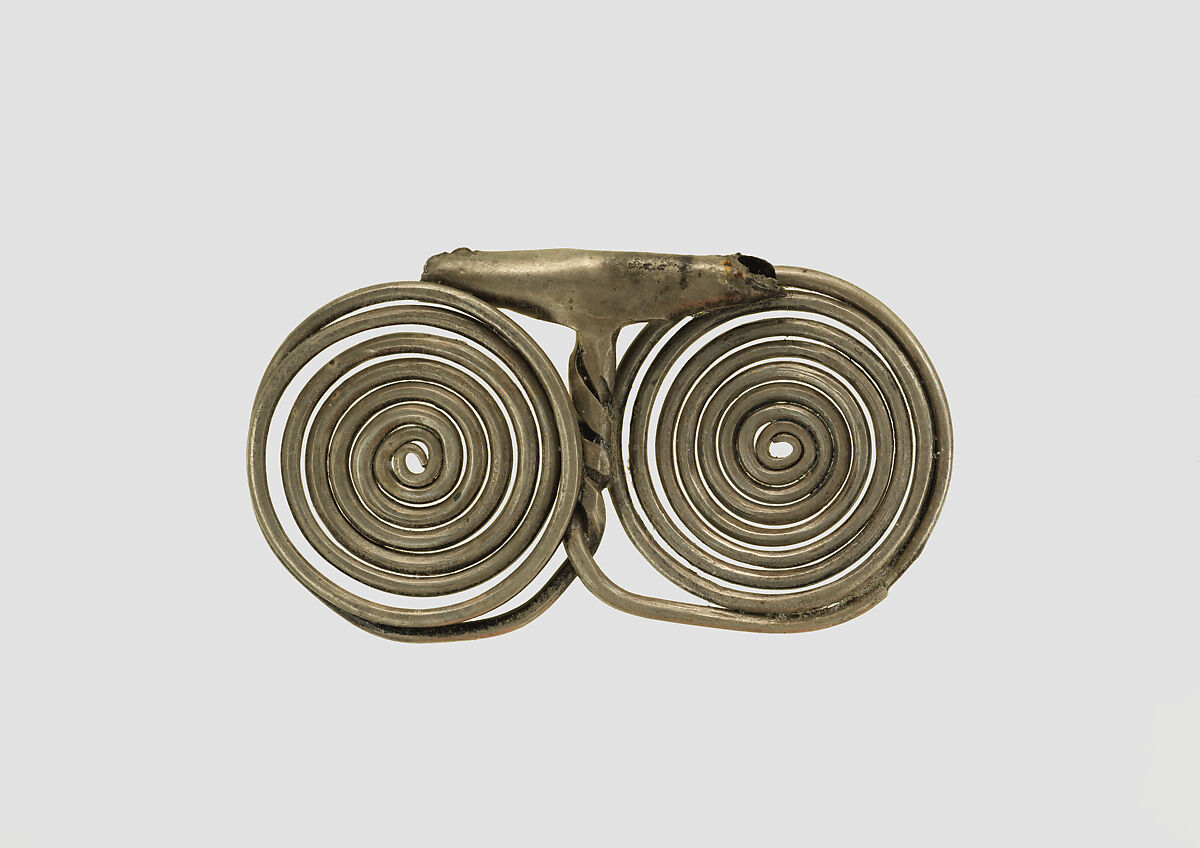 This silver pendant consists of two spirals connected by an intertwined stem. A horizontal sleeve for suspension is at the top. It was excavated at Tepe Nush-i Jan, an Iron Age hilltop site about 60 km sound of Hamadan in western Iran. Nush-i Jan was occupied in the 7th and 6th centuries B.C., and its occupants are generally thought to be the Medes, an Iranian people known from Assyrian, Achaemenid and Biblical sources. Though the textual sources portray them as a powerful empire, archaeological evidence for the Medes has yet to sustain this impression. Rather, they seem to have lived in scattered fortified sites in western and central Iran, without any clear capital. Nush-i Jan, one of the best known of these sites, features two temples, a columned hall, and a fort, where the pendant was found.