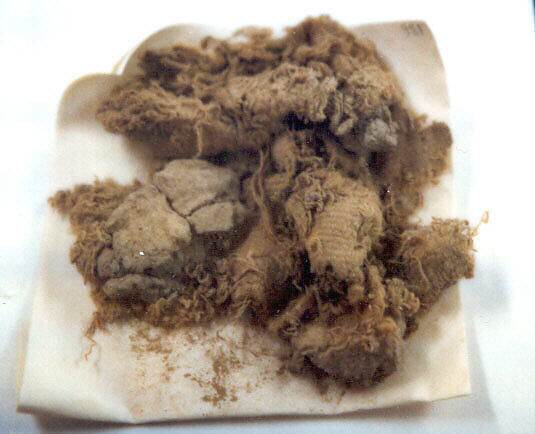 These textile fragments may be the remains of a piled carpet, though it is difficult to say given their present condition. They were excavated at Shahr-i Qumis in northern Iran, which has been identified as the ancient city of Hecatompylos, established by the Parthians as their capital by about 200 B.C. However, these fragments come from Room 23 at Site VI, which was seemingly converted into a burial chamber during the 6th century A.D., a date indicated by a coin of the Sasanian king Hormizd IV (reigned A.D. 579-590). The human remains discovered there consist of disarticulated bones, which is in keeping with Zoroastrian burial practice. Yet the bones appear to have been wrapped in leather and wool, which would be unusual for Zoroastrians, as is the inclusion of a coin with the body. Thus it is possible that in the 6th century Zoroastrian burial practices were still under development or that there were regional variations that are not recorded in surviving texts.