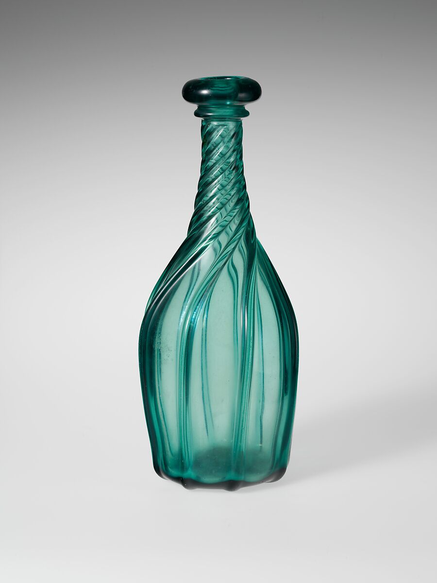 This decanter-shaped bar bottle was blown in a pillar mold. Eight "pillars" or ribs curve to the right and converge at the neck of the bottle.