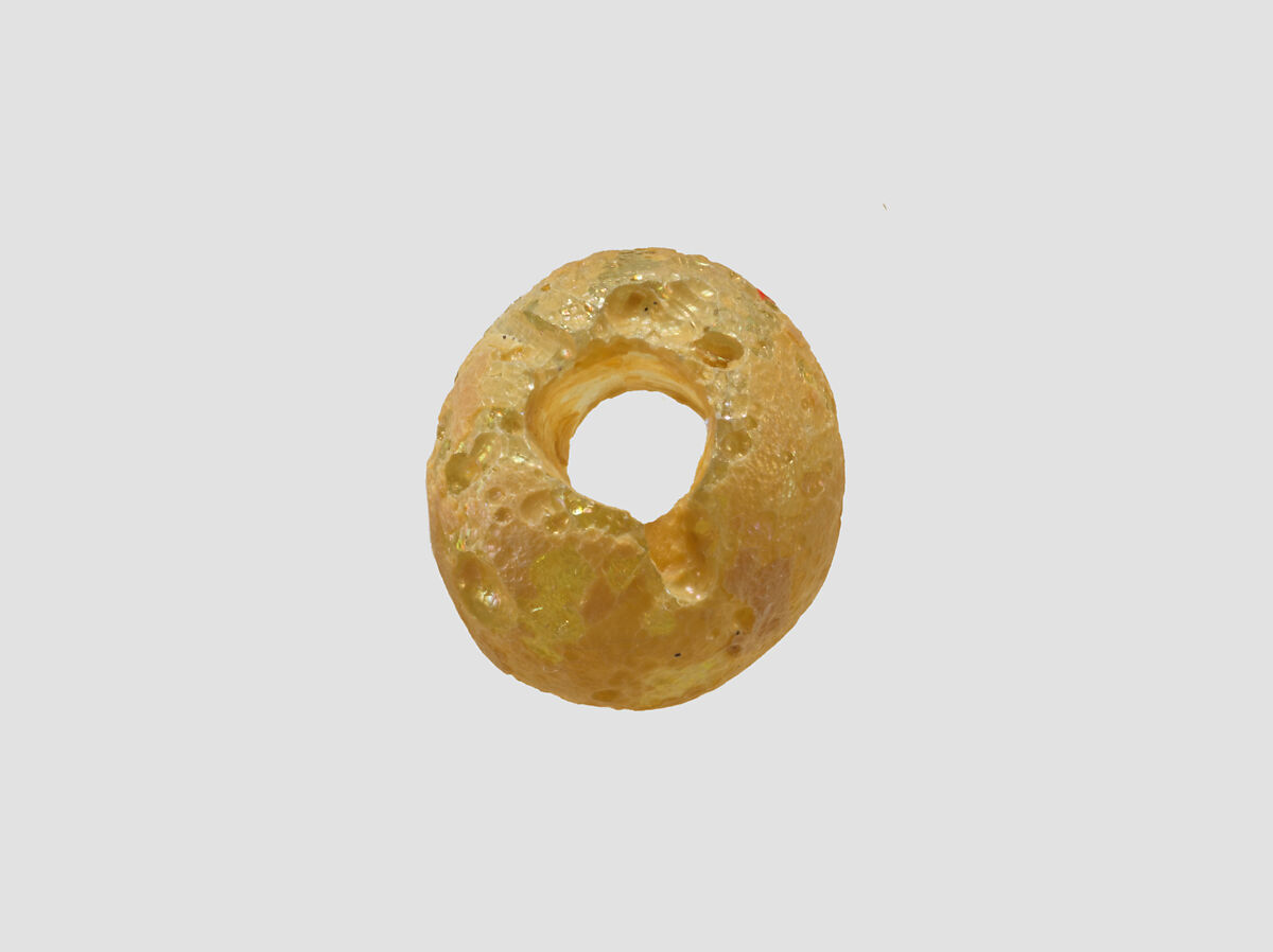This pale green glass bead was excavated at Tepe Nush-i Jan, an Iron Age hilltop site about 60 km sound of Hamadan in western Iran. Nush-i Jan was occupied in the 7th and 6th centuries B.C., and its occupants are generally thought to be the Medes, an Iranian people known from Assyrian, Achaemenid and Biblical sources. Though the textual sources portray them as a powerful empire, archaeological evidence for the Medes has yet to sustain this impression. Rather, they seem to have lived in scattered fortified sites in western and central Iran, without any clear capital. Nush-i Jan, one of the best known of these sites, features two temples, a columned hall, and a fort. The bead was discovered in the columned hall.